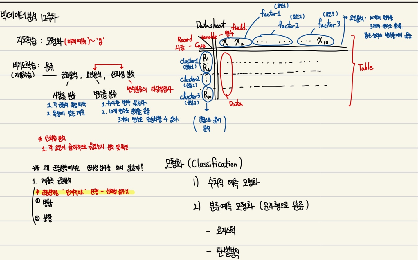 - 비지도학습의 큰 특징으로는 "분류" 이다. 비지도학습에는 군집 분석, 요인 분석, 신뢰성 분석이 있고 크게 보면 군집분석과 요인+신뢰성 분석이다.
