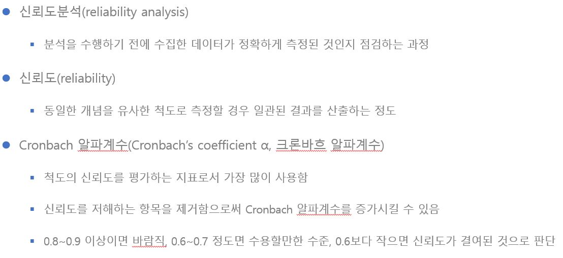 A 계층적 군집분석을 예시로, 군집분석은 단계적으로 진행이 되기 때문에, 신뢰성 검사가 따로 필요하지 않다.