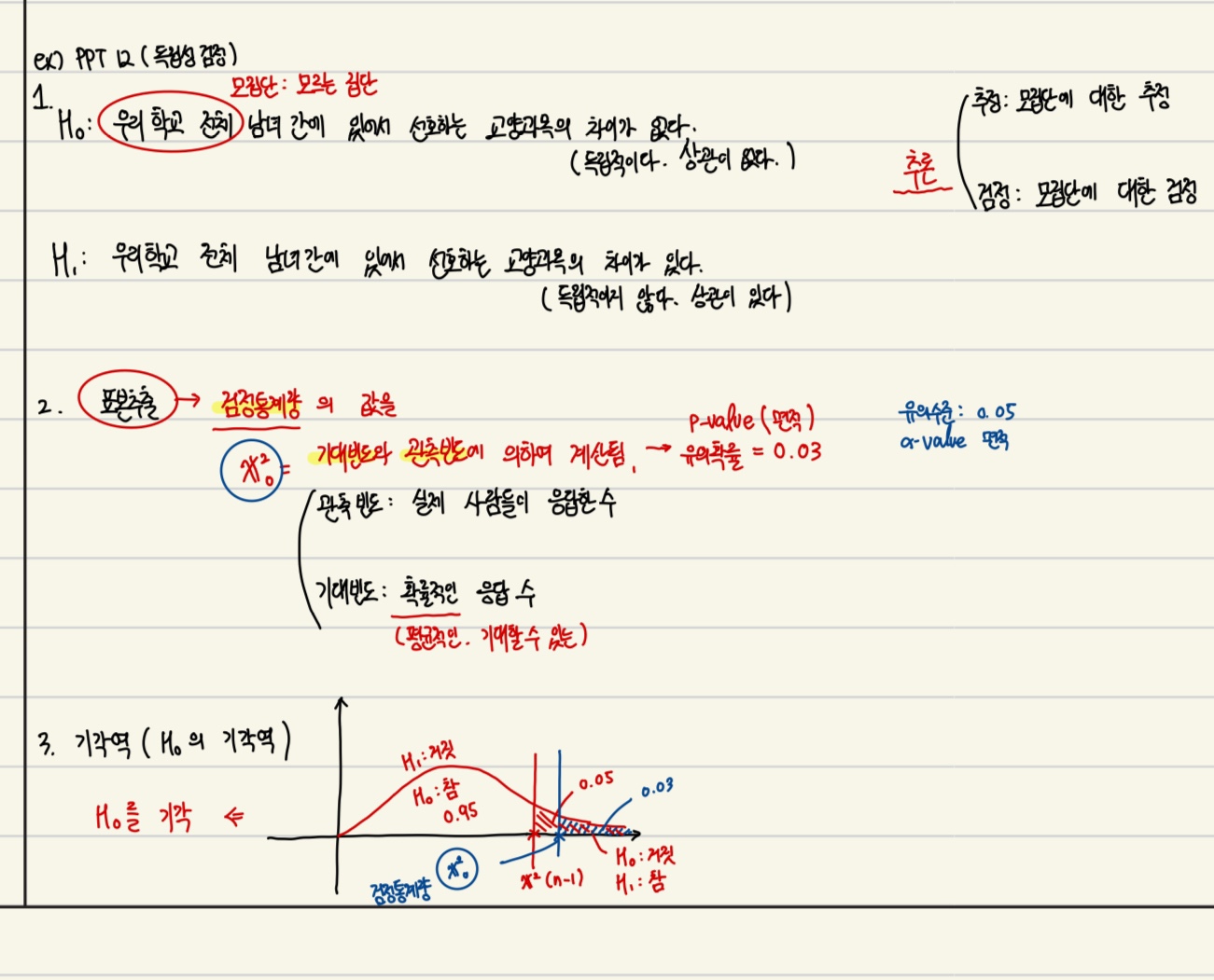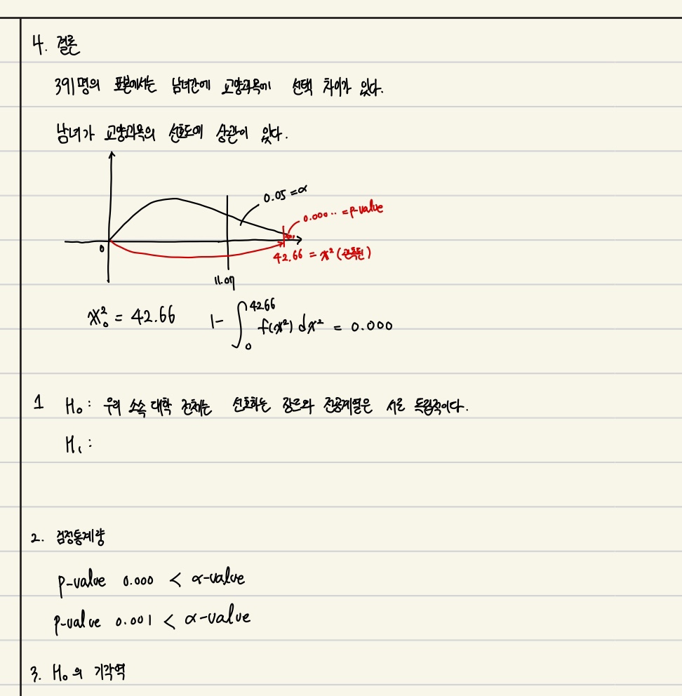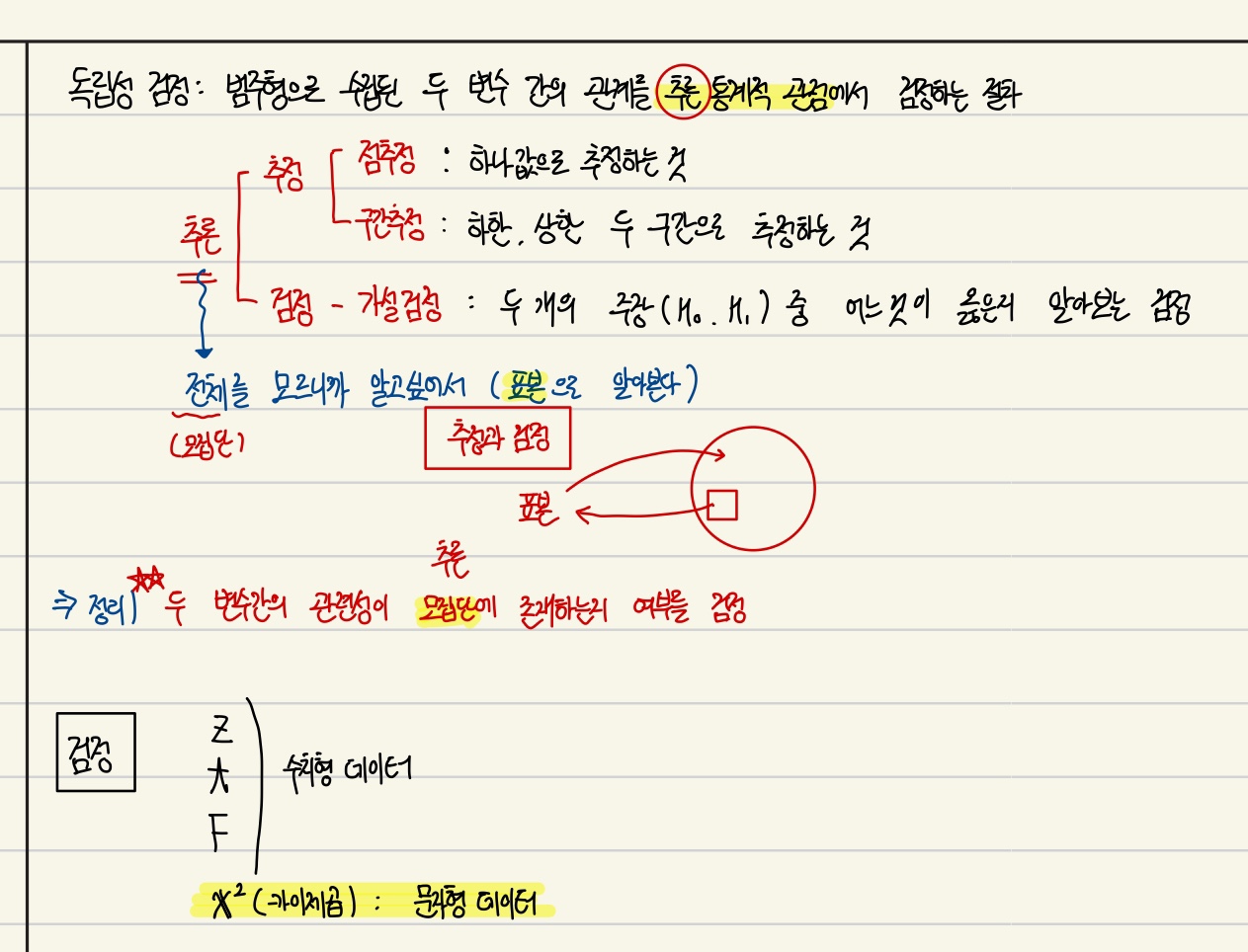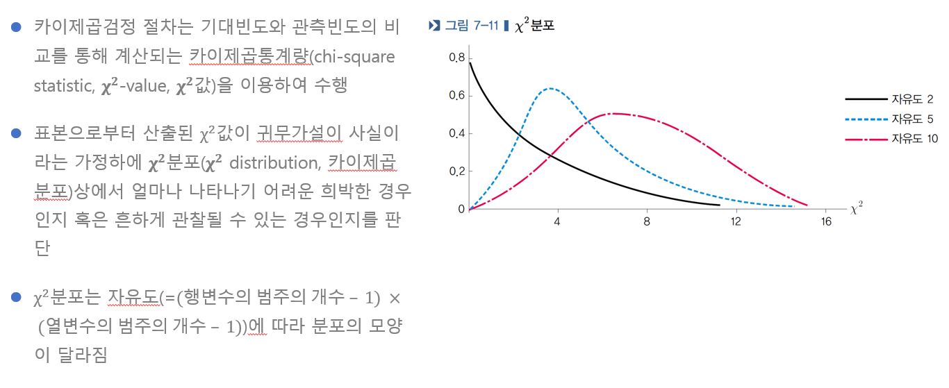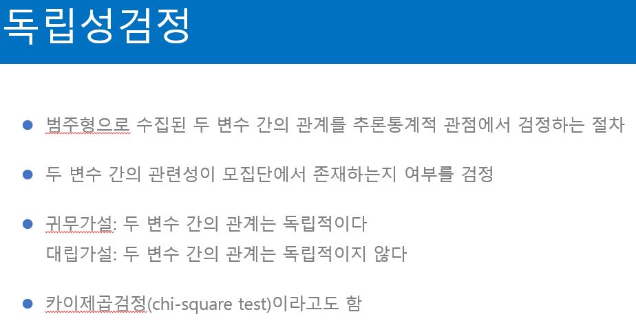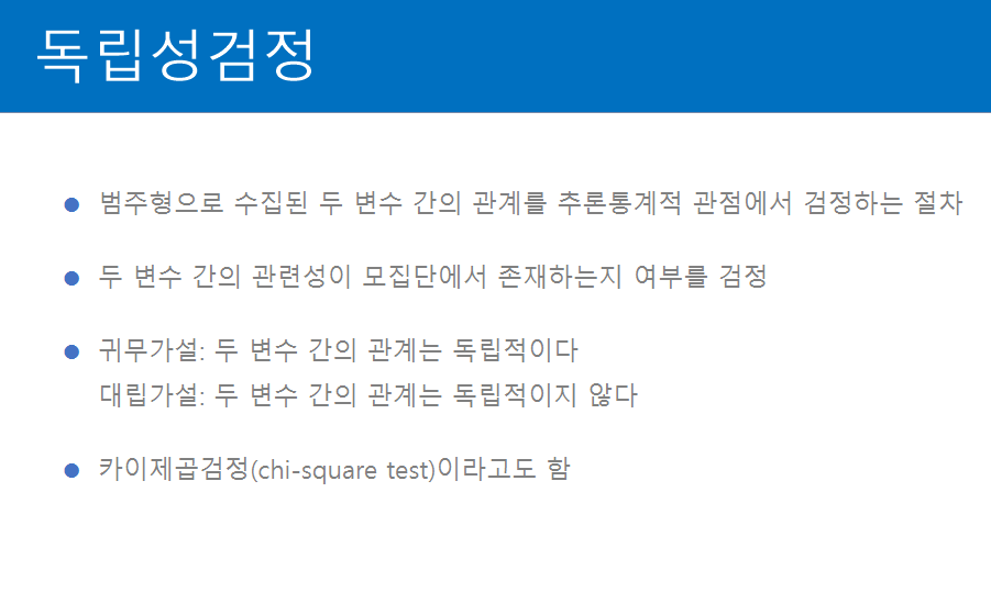 - 독립성검정(independence test)을 통해 범주형 변수 간의 관계에 대한 가설검정을 수행