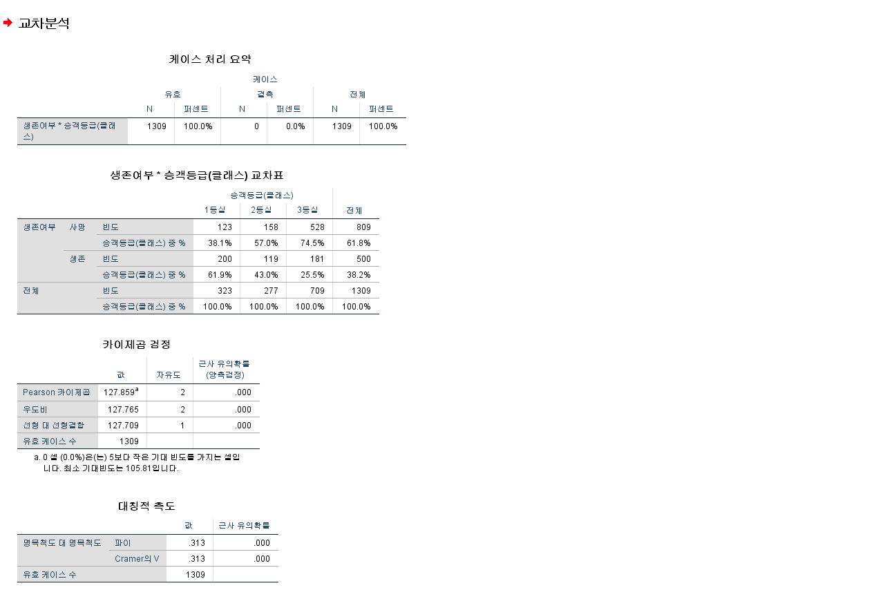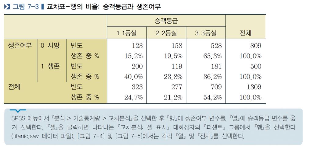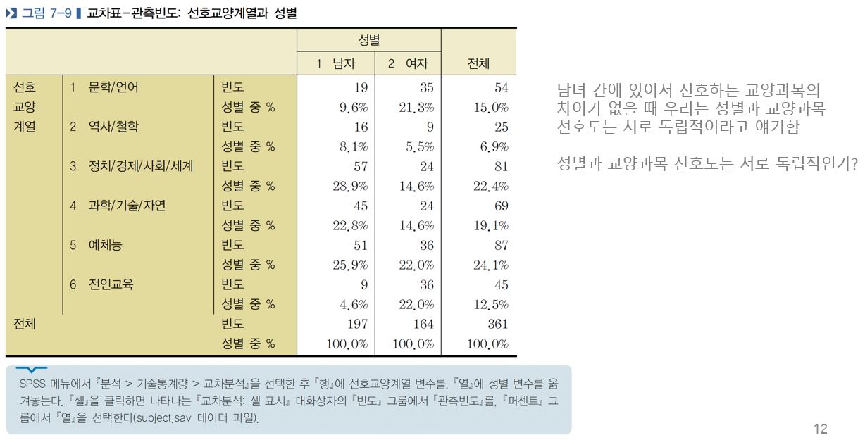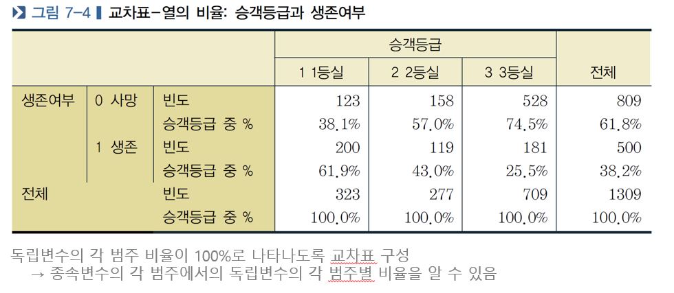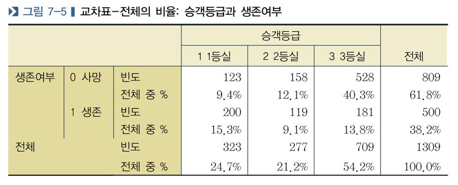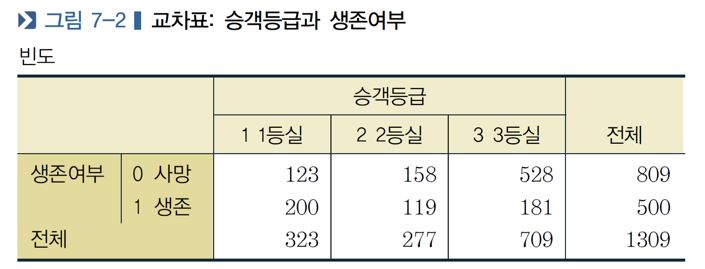 - 교차표에 두 변수를 조합하였을 때, 발생할 가능성이 없거나 희박한 경우가 나타난다면 데이터에 오류가 있을 수도 있음을 의미한다.
