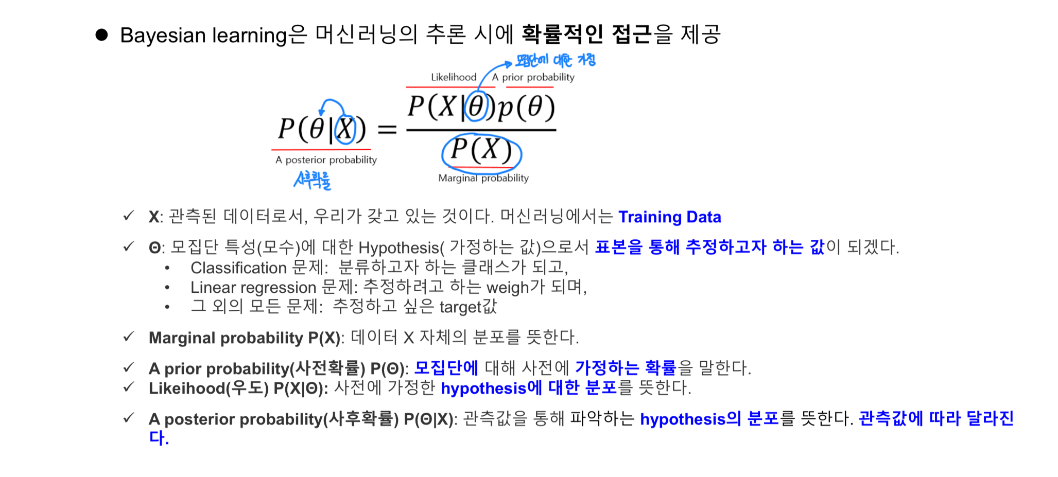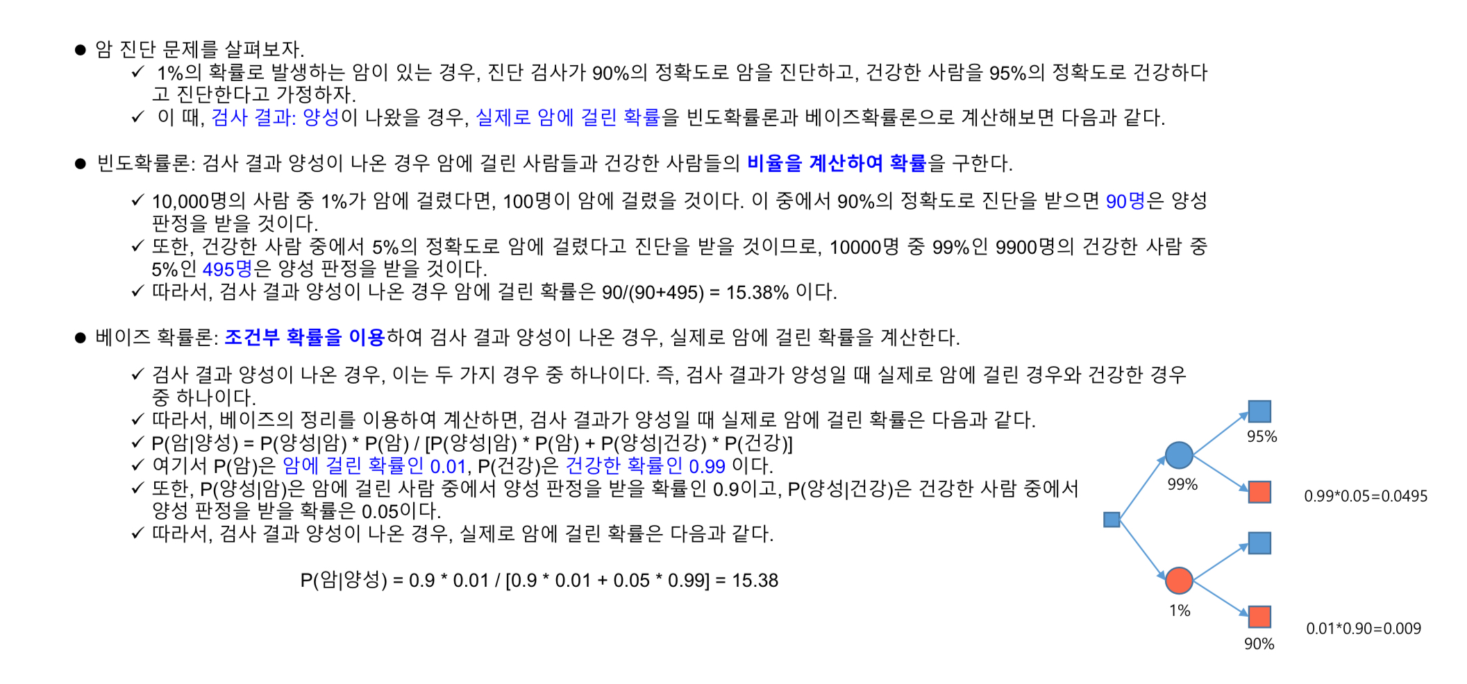 - 베이즈확률론은 사전 정보와 현재 관측된 데이터를 결합하여 어떤 사건이 일어날 확률을 계산하는 것이다.