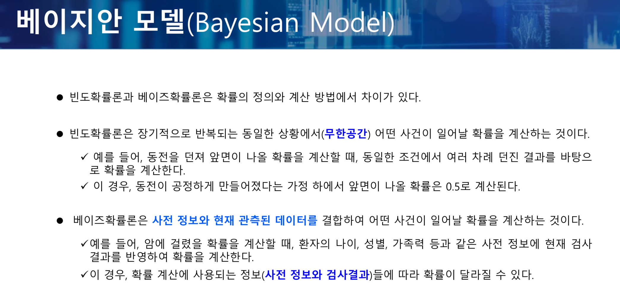 - 베이즈확률론은 사전 정보와 현재 관측된 데이터를 결합하여 어떤 사건이 일어날 확률을 계산하는 것이다.