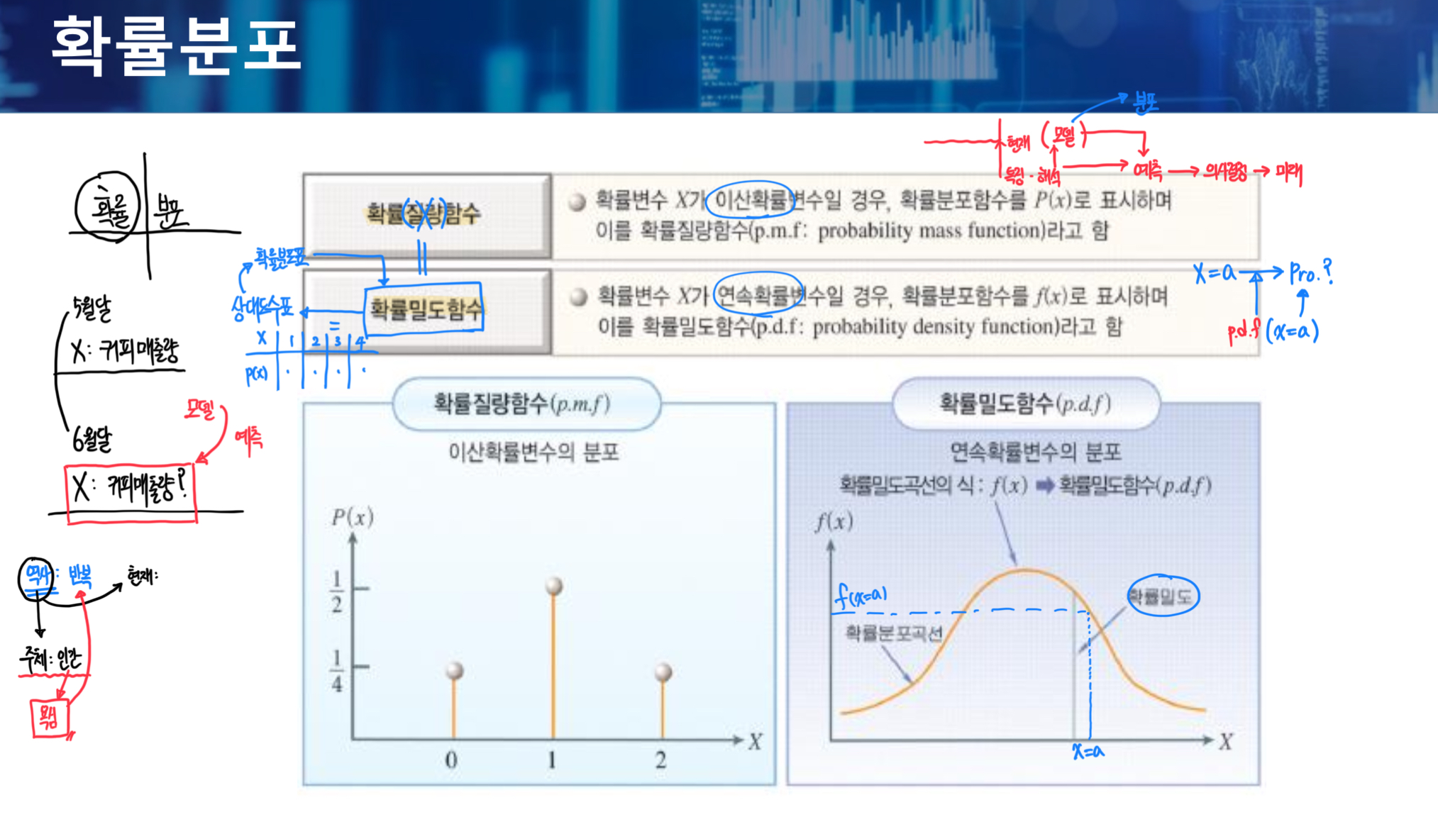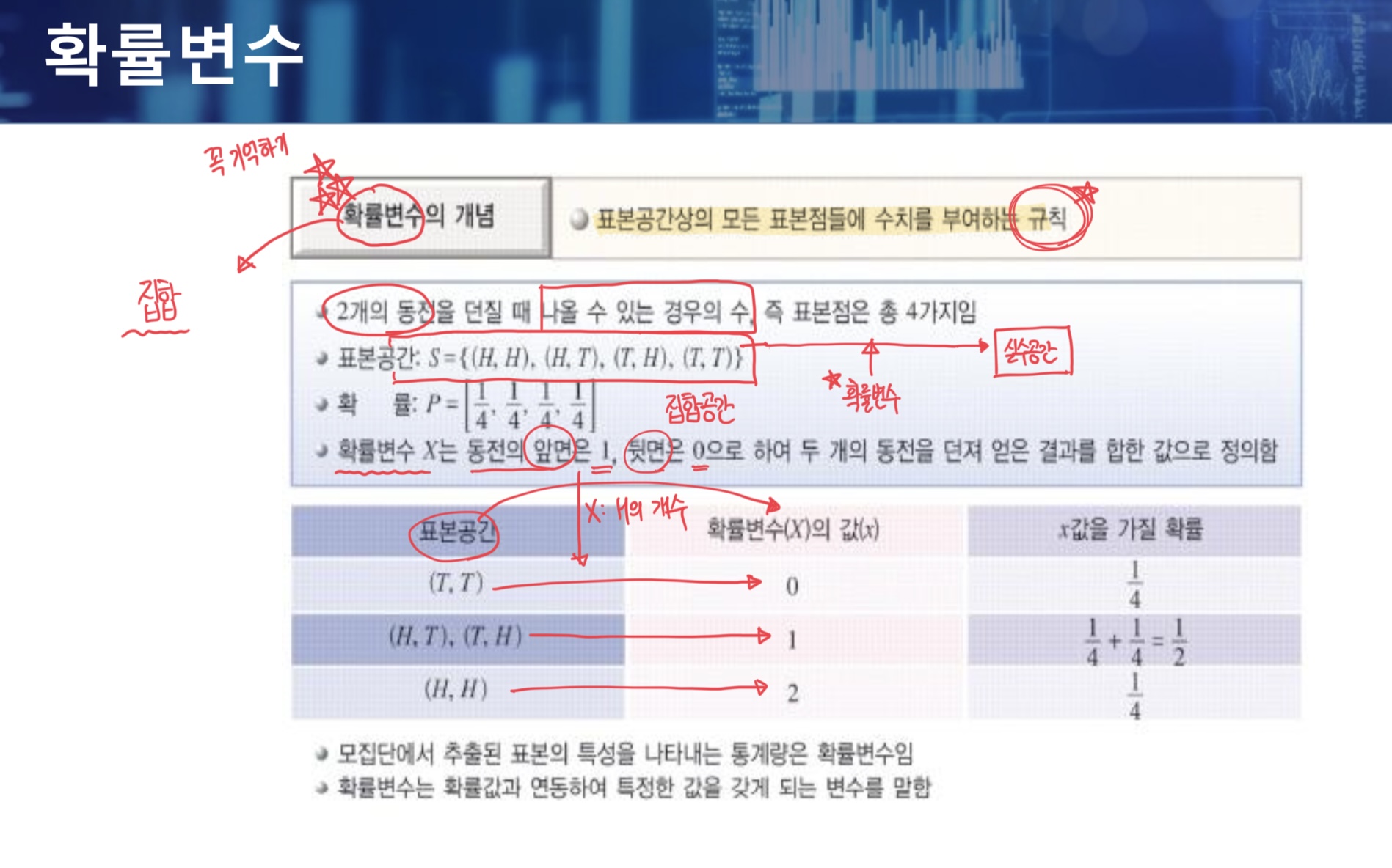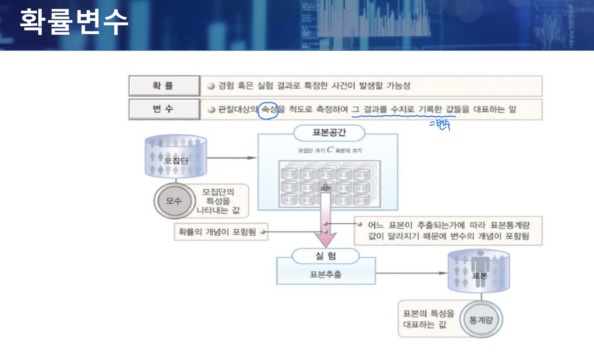 - 확률변수는 변하긴 하나, 예측이 불가능한 변수이다. 뽑을 때마다, 규모가 바뀌어 변하긴 하는데 예측이 되지 않는 것이다.