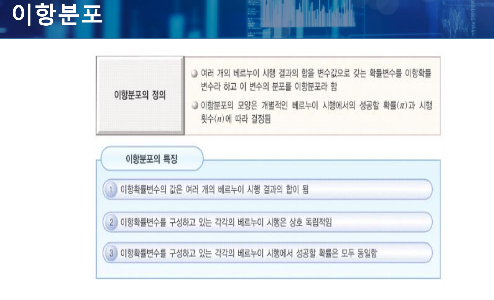 - 베르누이 시행 : 실험 결과로 단지 2가지 종류의 결과만을 얻을 수 있는 시행이다.