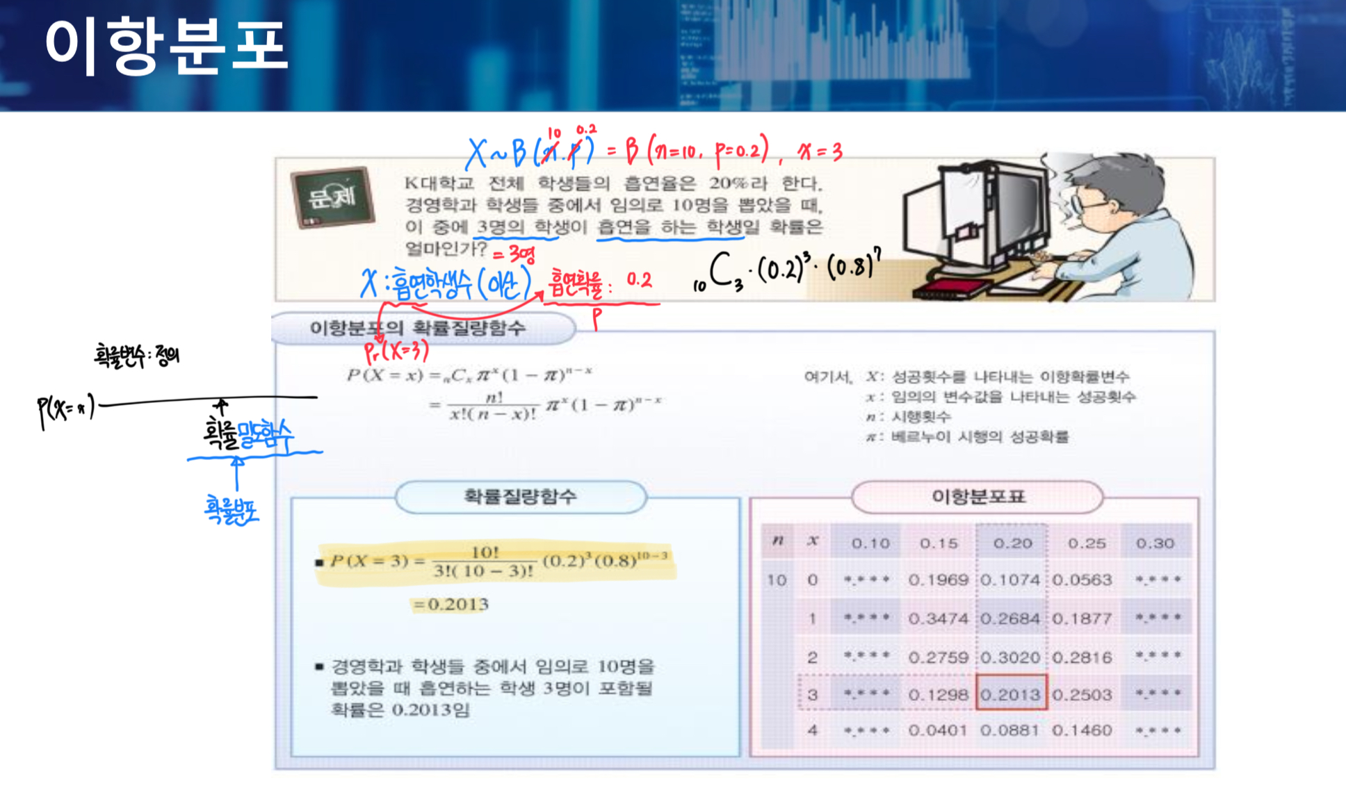 - 성공확률이 p인 베르누이 시행을 반복해서 n회 시행했을 경우, 성공한 횟수를 변수값으로 하는 이항확률변수분포의 확률질량함수