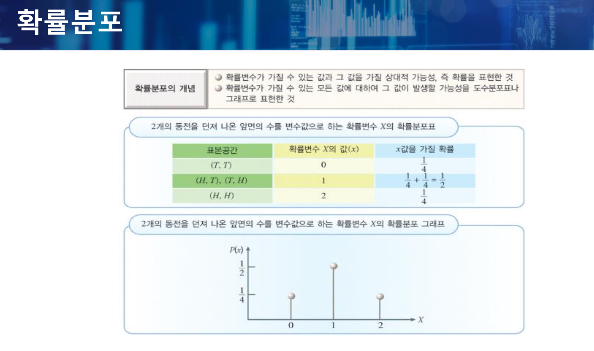 확률분포 : 확률변수가 가질 수 있는 모든 값에 대하여 그 값이 발생할 가능성을 도수분포표나 그래프로 표현한 것이다.