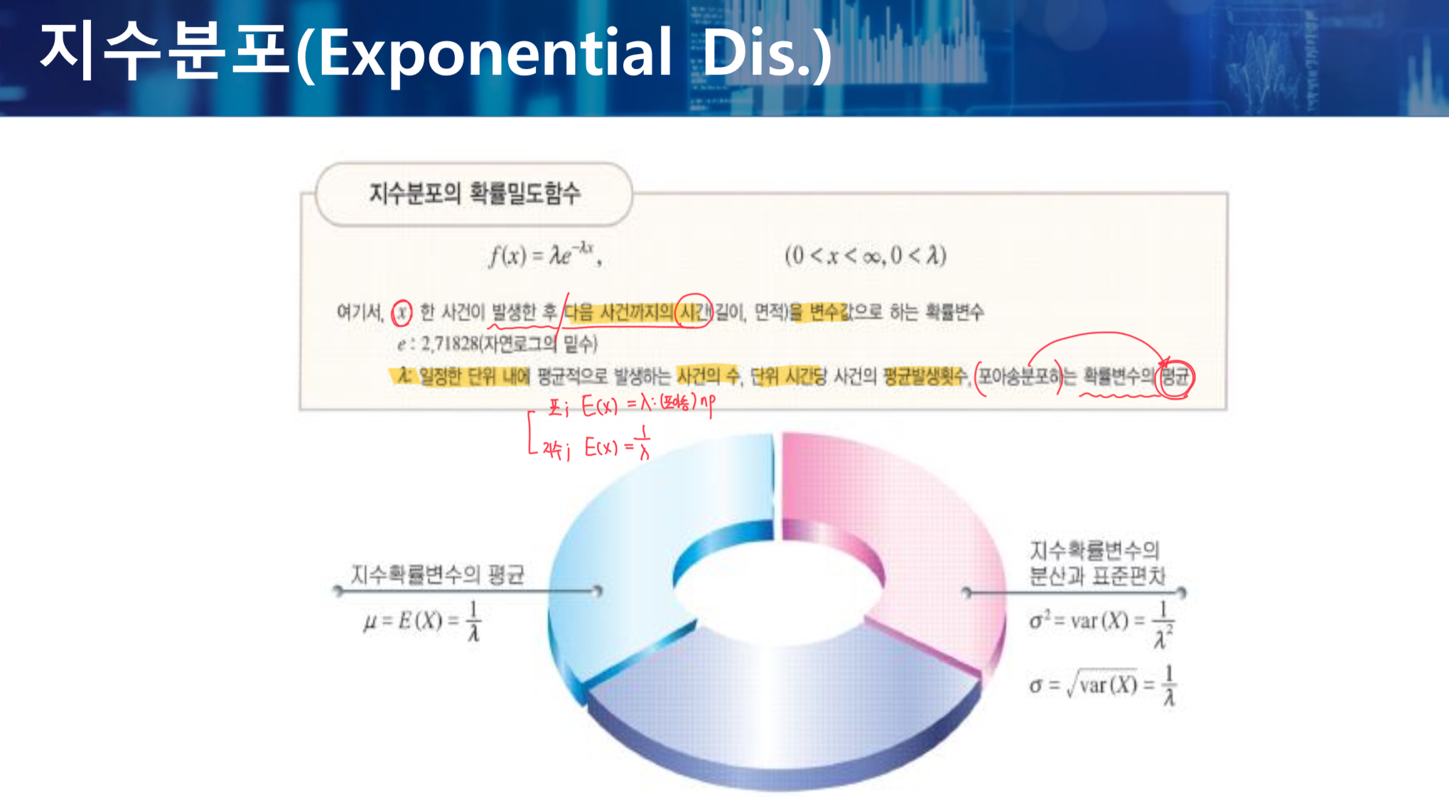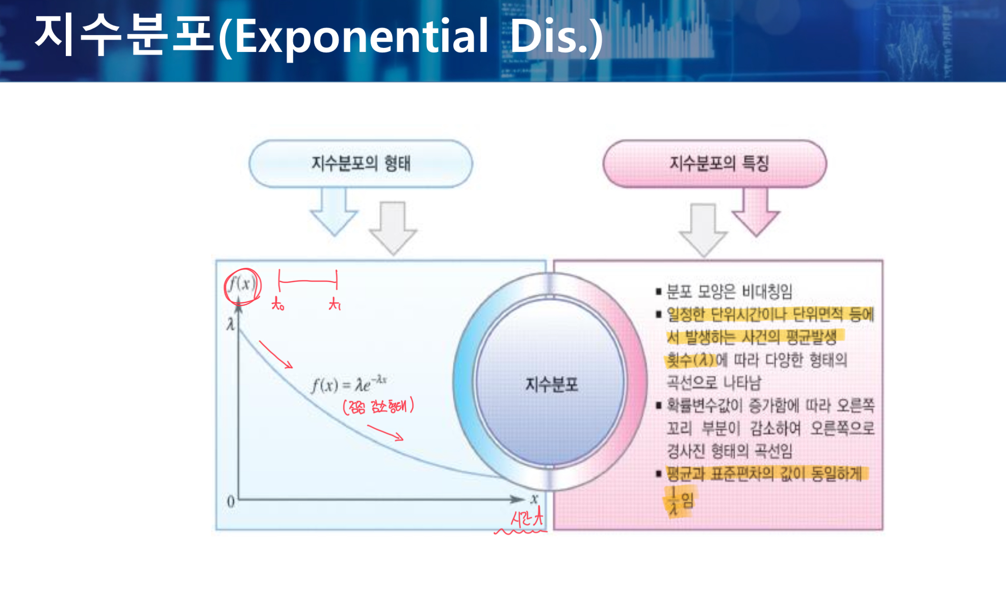 지수분포 식 : (람다) * e^(-람다 * x), 평균 = 표준편차 = 1 / 람다