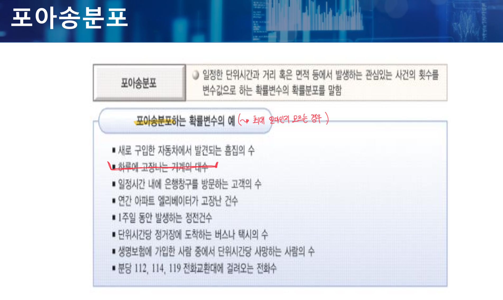 - 포아송분포하는 확률변수 예시의 특징으로는 최대 얼마인지 모르는 경우이다.
