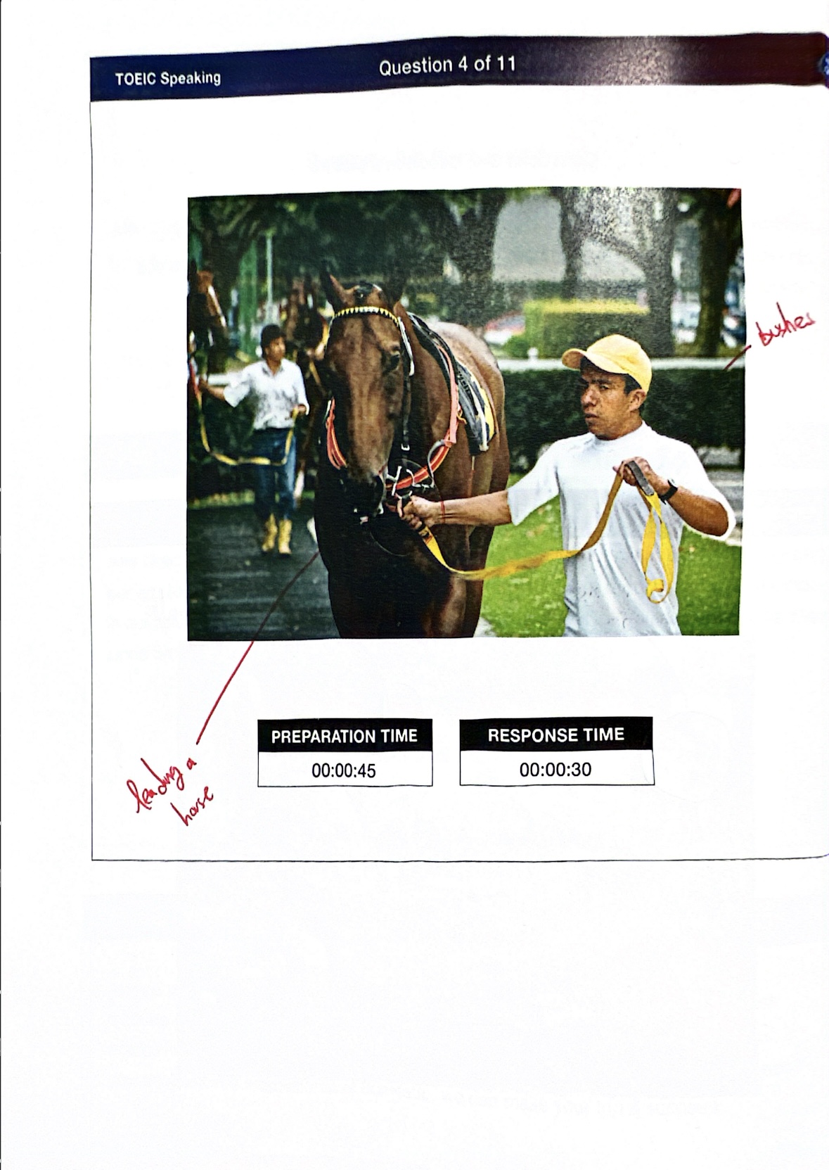 My Answer : I think this picture was taken in a park. There are two people in this picture. In front of the picture, a man who is wearing yellow cap is leading a horse using yellow strap. In background of the picture, another man who is wearing yellow boots is also leading a horse using yellow strap. I can see many trees and bushes. It seems like the weather is sunny and peaceful.