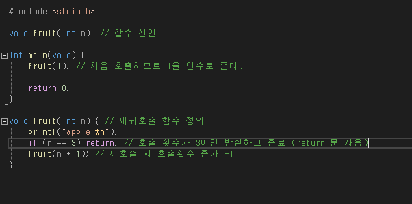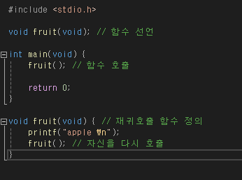 실행 결과는 상당히 많은 apple을 출력하고 중간에 종료된다. 함수는 호출만으로도 일정 크기의 메모리를 사용하므로 무한 호출하게 되면 하나의 프로그램이 쓸 수 있는 메모리 (해당 프로세스에 할당된 스택 메모리) 를 모두 사용하여 강제 종료된다. " 재귀호출 함수는 반복 고리를 끊을 수 있는 조건식을 반드시 포함해야 한다."