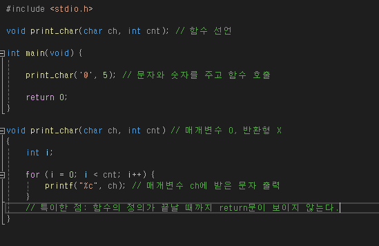 | 반환형 X | 선언 | void print_char(char ch, int cnt); |