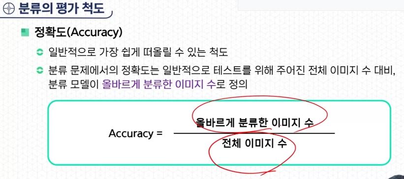 - 분류 문제에서의 정확도는 일반적으로 테스트를 위해 주어진 전체 이미지 수 대비, 분류 모델이 올바르게 분류한 이미지 수로 정의한다.
