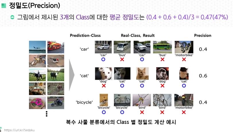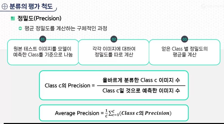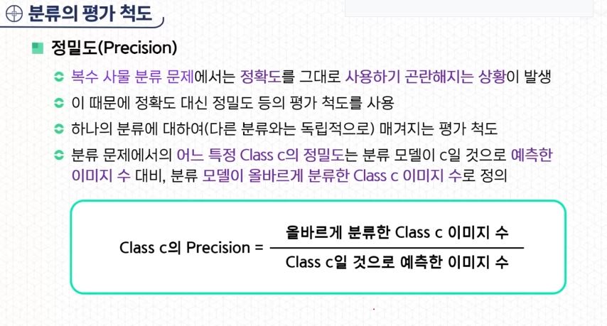 - 분류 문제에서의 어느 특정 클래스 C의 정밀도는 분류 모델이 C일 것으로 예측한 이미지 수 대비, 분류 모델이 올바르게 분류한 클래스 C 이미지 수로 정의한다.