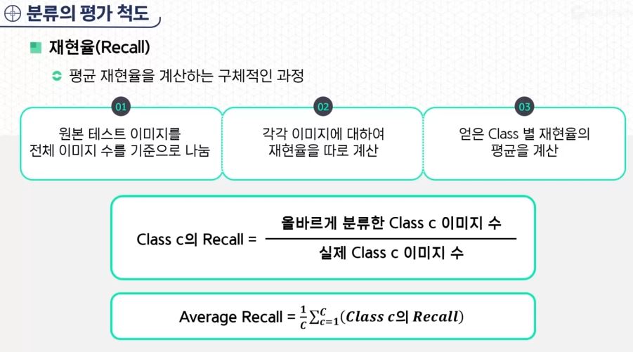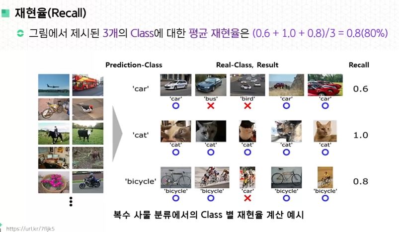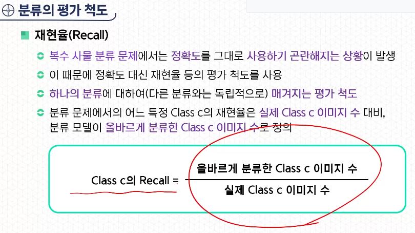 - 분류 문제에서의 어느 특정 Class C의 재현율은 실제 Class C 이미지 수 대비, 분류 모델이 올바르게 분류한 Class C 이미지 수로 정의