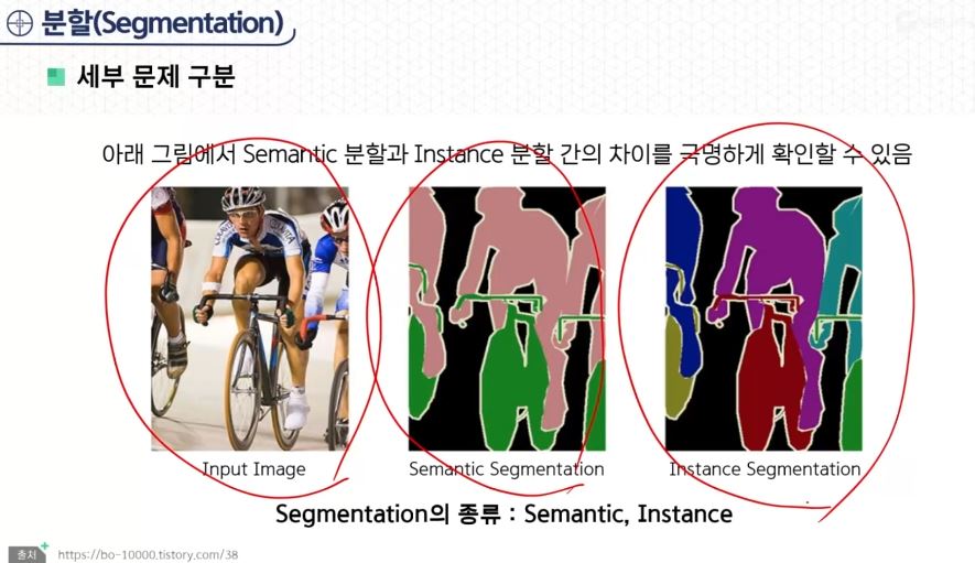 - Semantic 분할은 한 클래스에 여러 사람이 나오면 같은 객체로 보지만, Instance 분할은 사람 내에서 여러 사람이라면 각각 다른 객체로 인식하는 것이다.
