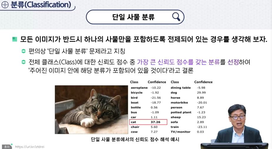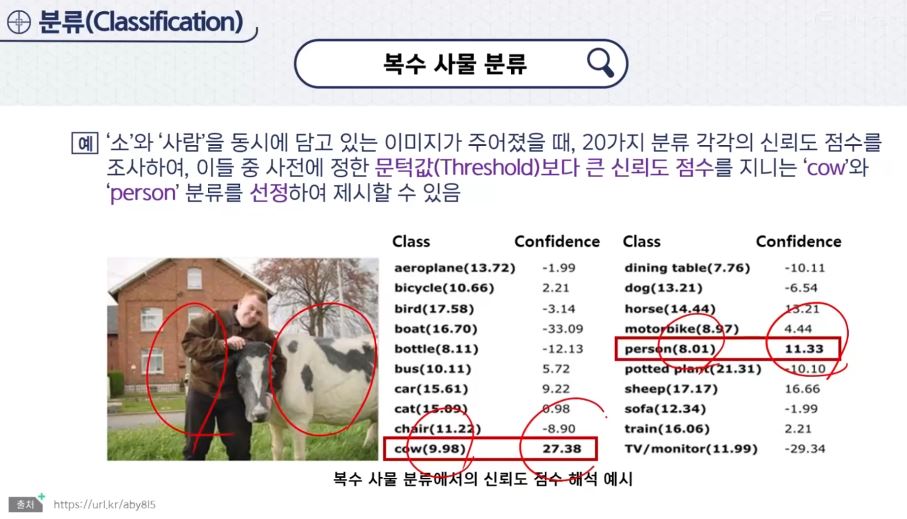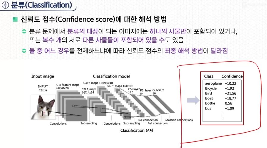 - 신뢰도 점수에 대한 해석 방법 : 분류 문제에서 분류의 대상이 되는 이미지에는 여러 개의 사물이 있을 수 있다. 둘 중 어느 경우를 전제하느냐에 따라 신뢰도 점수의 최종 해석 방법이 달라진다.