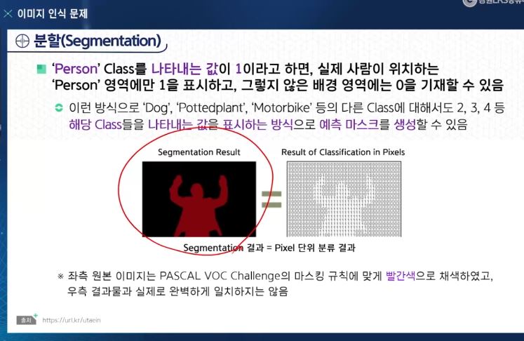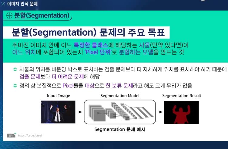 - 주어진 이미지 안에 어느 특정한 클래스에 해당하는 사물(만약 있다면)이 어느 위치에 포함되어 있는지 'PIXEL 단위'로 분할하는 모델을 만드는 것
