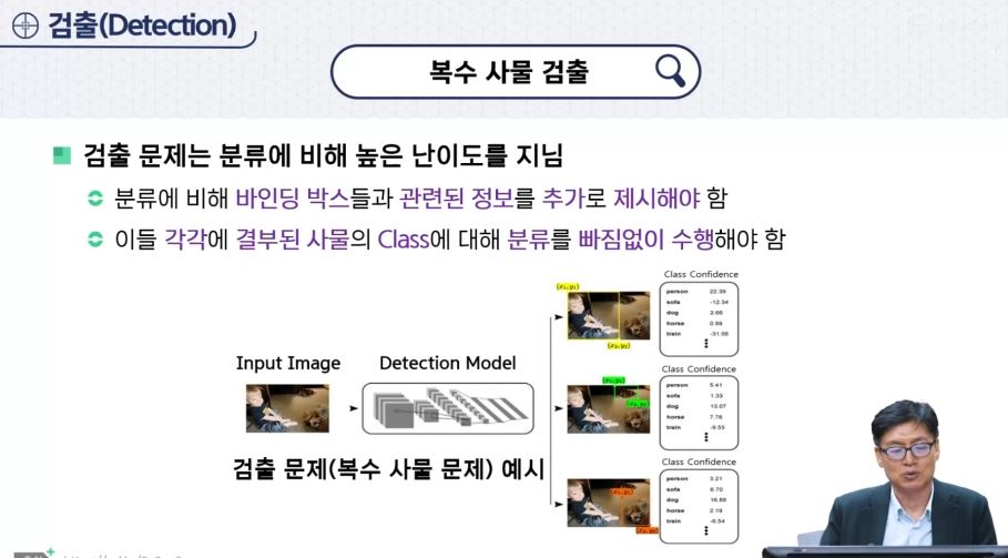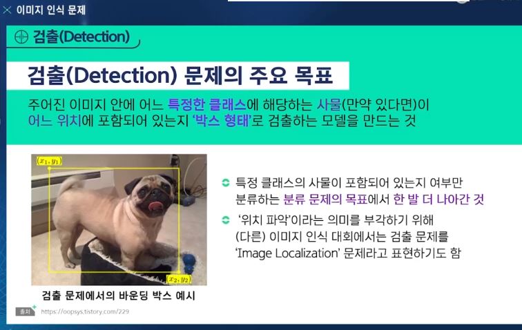 - Detection (검출) : 물체의 레이블을 예측하면서 그 물체가 어디에 있는지 정보를 제공