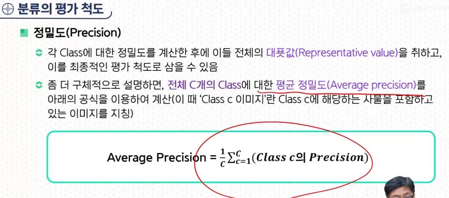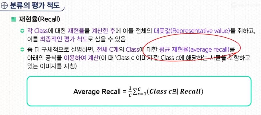 - 각 Class에 대한 정밀도를 계산한 후에 이들 전체의 대푯값(Representative value)을 취하고, 이를 최종적인 평가 척도로 삼을 수 있다. (전체 C개의 Class에 대한 평균 정밀도를 계산)