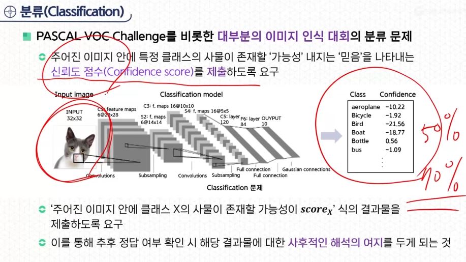 - PASCAL VOC Challenge 이미지 인식 대회의 경우에는 각 분류마다 문턱값 (Threshold, 임계값)을 미리 설정해 놓고, 주어진 이미지의 각 분류별 신뢰도 점수가 Threshold보다 큰 경우에 한하여 주어진 이미지 안에 해당 분류가 포함되어 있을 것이다라고 결론을 내린다.
