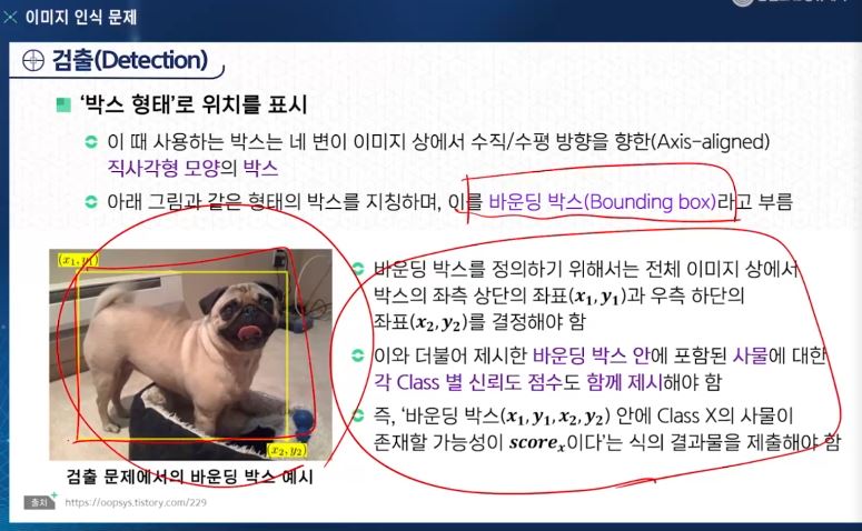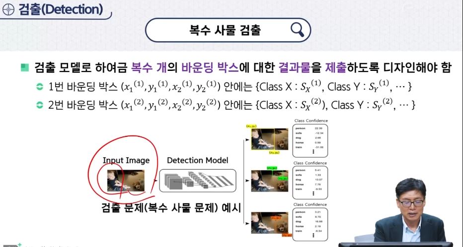 - 주어진 이미지 안에 어느 특정한 클래스에 해당하는 사물(만약 있다면)이 어느 위치에 포함되어 있는지 '박스 형태'로 검출하는 모델을 만드는 것