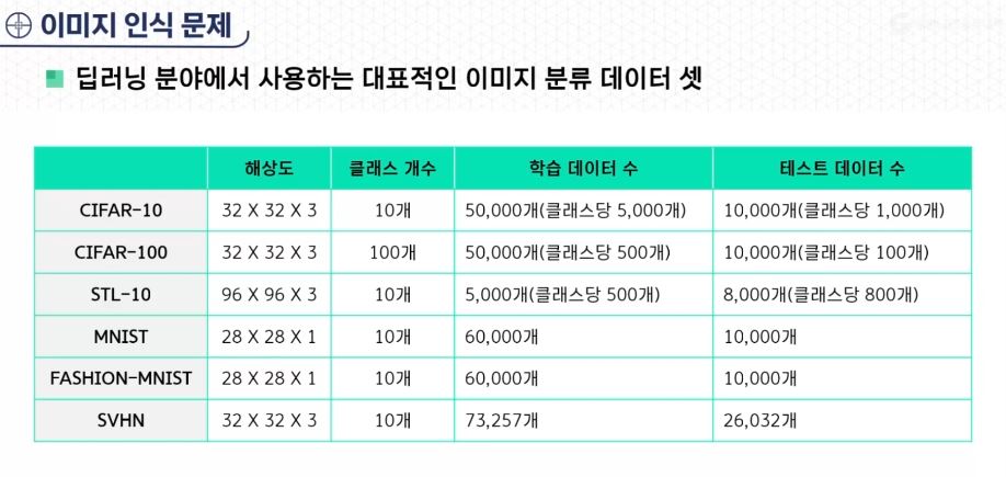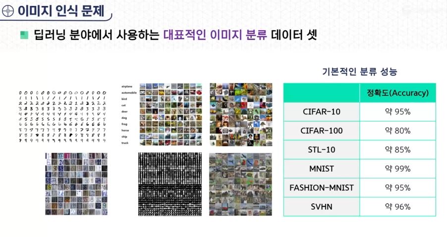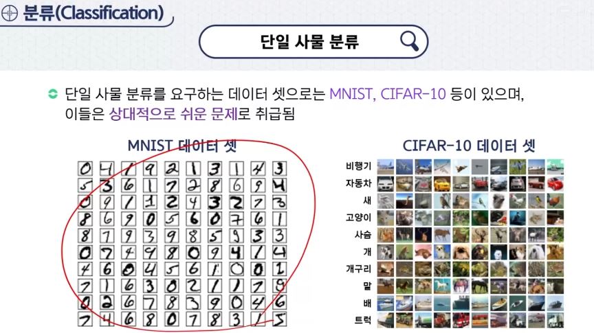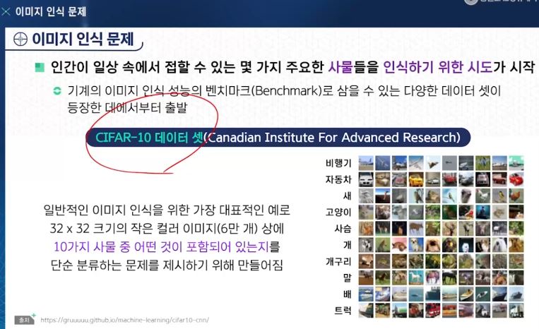 - CIFAR-10 데이터 셋 : 10가지 사물 중 어떤 것이 포함되어 있는지를 단순 분류하는 문제 제시하기 위해 만들어짐.