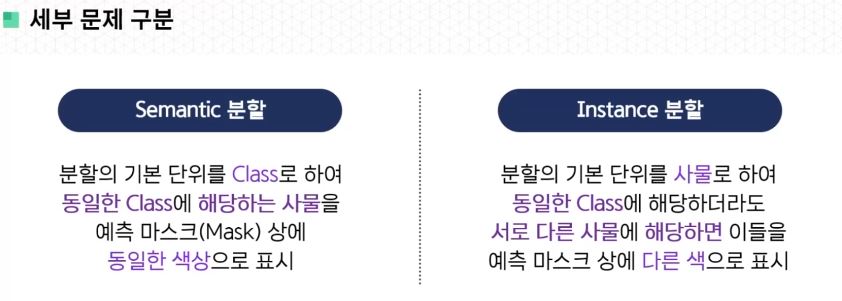 - Instance 분할 : 분할의 기본 단위를 사물로 하여 동일한 Class에 해당하더라도 서로 다른 사물에 해당하면 이들을 예측 마스크 상에 다른 색으로 표시