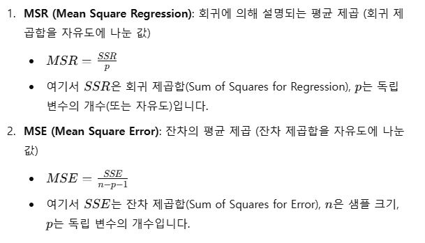 - F-통계량 = MSR/MSE, MSR은 모델이 설명하는 변동을 나타내고 MSE는 잔차의 변동, 즉 모델이 설명하지 못하는 변동을 나타낸다.