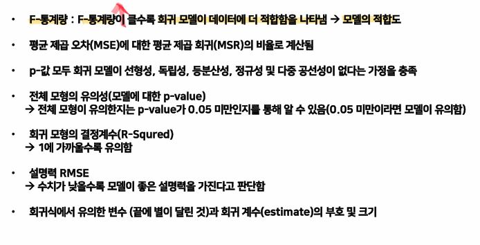 - F-통계량 : F-통계량이 클수록 회귀 모델이 데이터에 더 적합함을 나타낸다. → 모델의 적합도