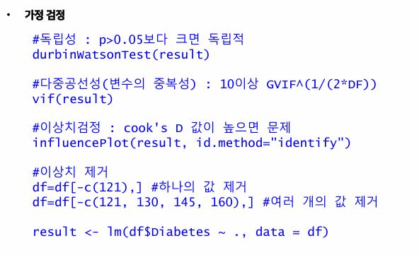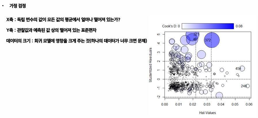- influencePlot() : 이상치 검정 → cook's D 값이 높으면 문제 및 제거