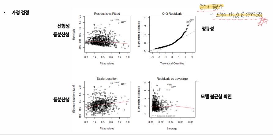 회귀분석 전에는 독립성과 다중공선성을 판단해야하지만, 회귀분석 후에는, 정규성, F-통계량, p-value, RMSE, R-Squared, 다중공선성 판단을 해야한다.
