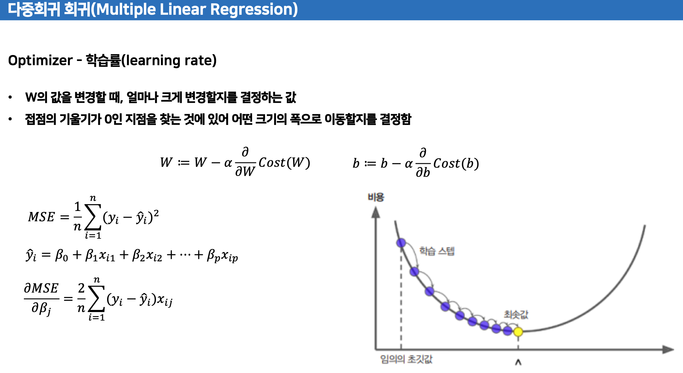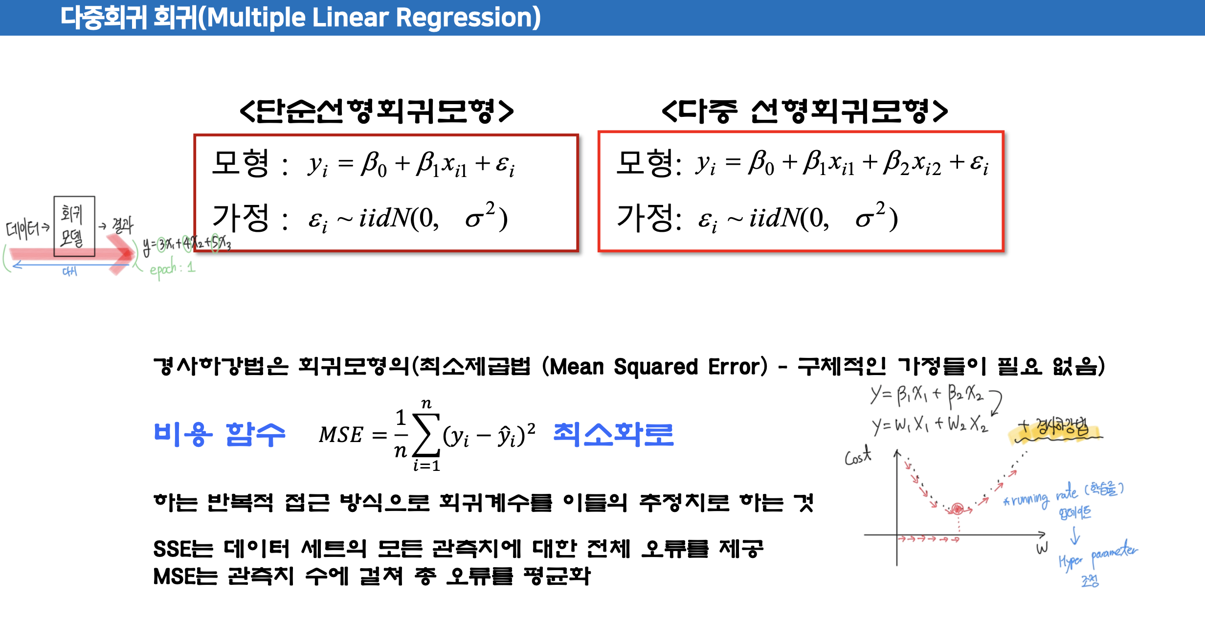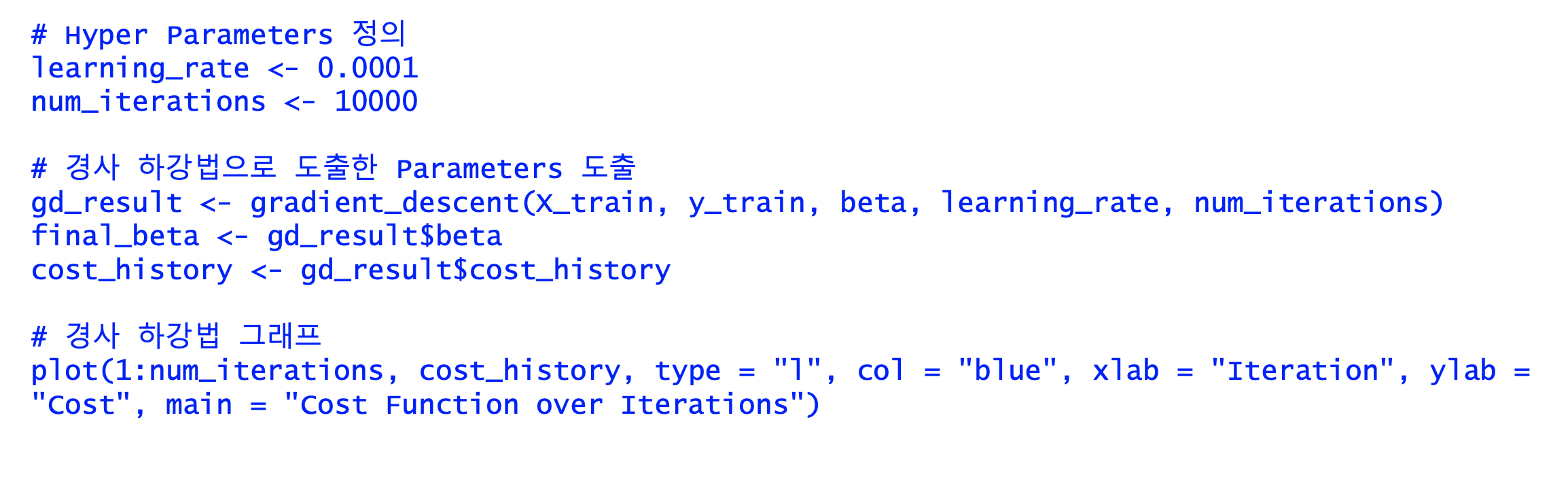 경사하강법는 회귀모형의 비용함수 최소화로 하는 반복적 접근 방식으로 회귀계수를 이들의 추정치로 하는 것이다.