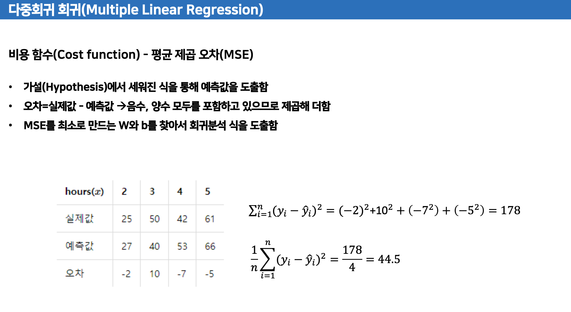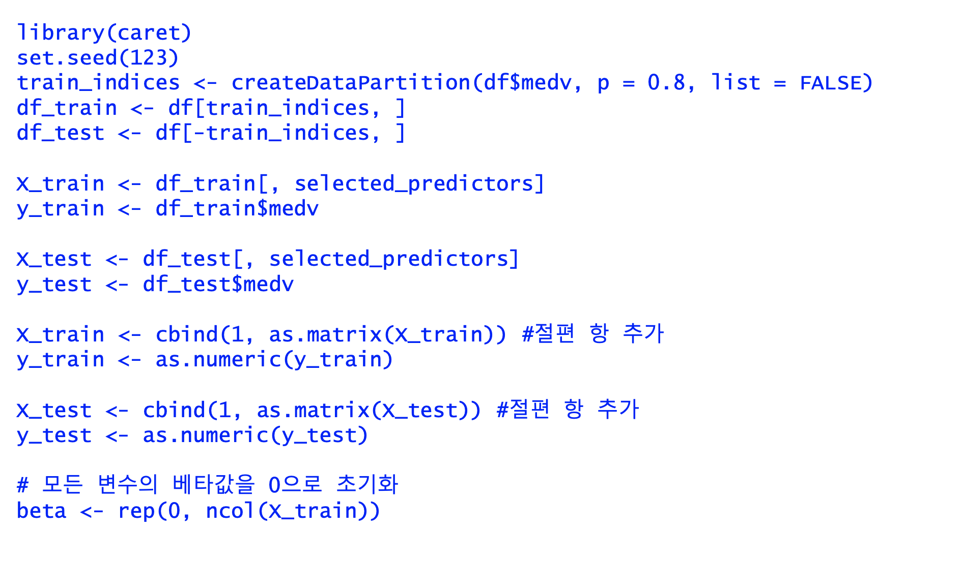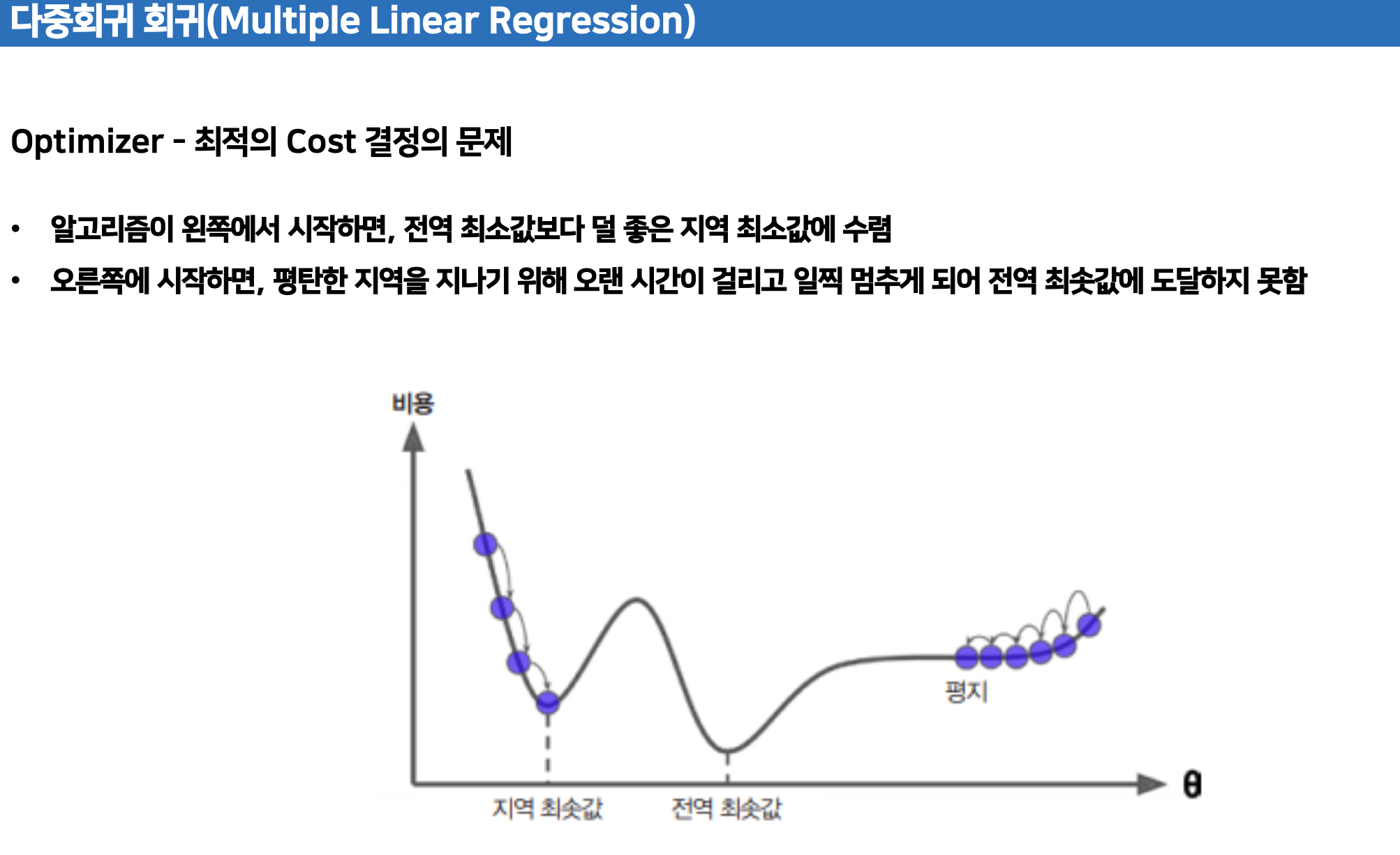 경사하강법는 회귀모형의 비용함수 최소화로 하는 반복적 접근 방식으로 회귀계수를 이들의 추정치로 하는 것이다.