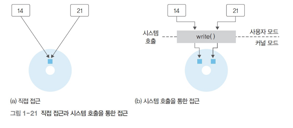 - 사용자가 자원에 직접 접근하는 것을 막음으로써 컴퓨터 자원을 보호한다. 이를 위해 응용 프로그램과 사용자에게서 모든 컴퓨터 자원을 숨긴다. → 악의적인 사용자가 하드 디스크의 아무 곳에나 데이터를 저장해 다른 사람의 데이터를 지우거나 덮어쓰는 일이 발생XXX