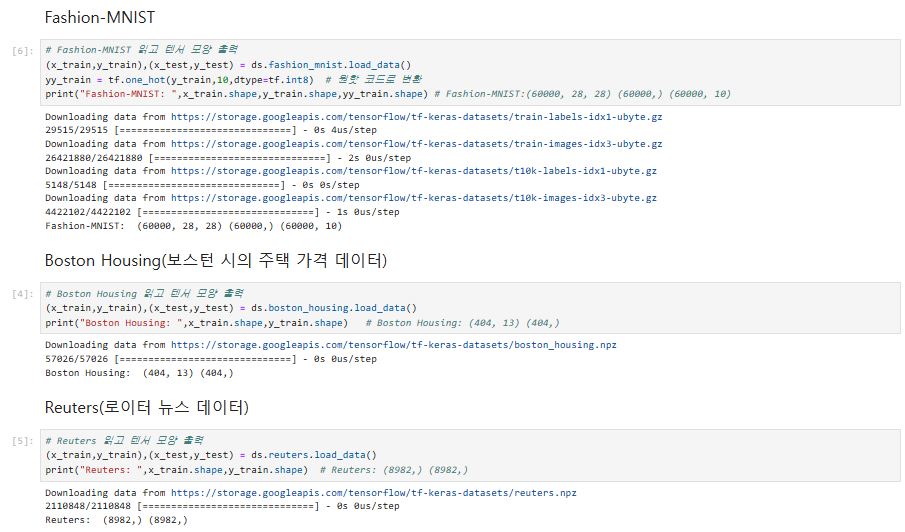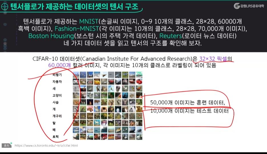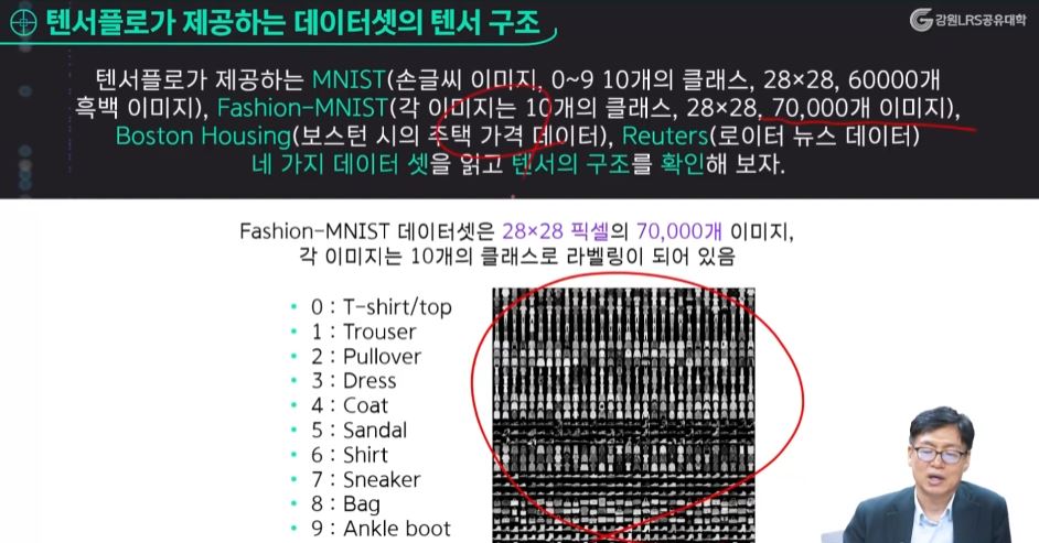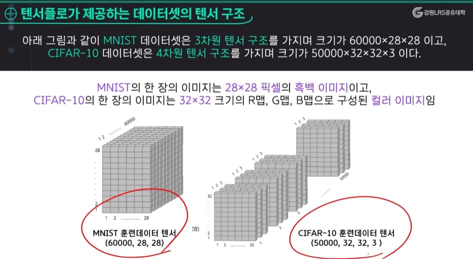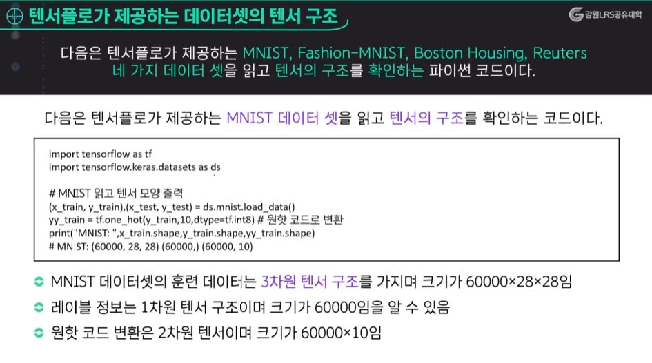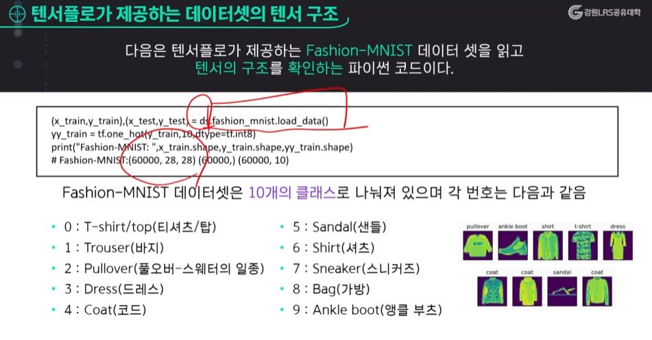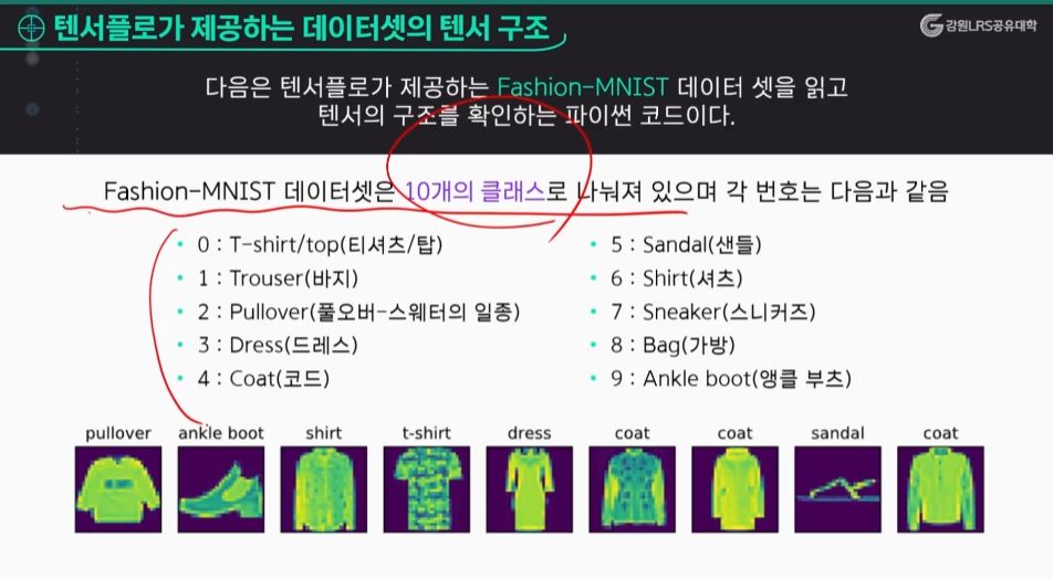 텐서플로가 제공하는 데이터셋의 텐서 구조 : 10개의 클래스 각각 70000개 이미지 데이터 셋이 존재