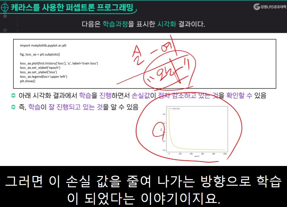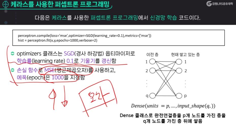 이 오차를 가중치에 어떻게 반영할 것이냐, 반영하는 방법을 우리가 옵티마이저라고 하는데, 이 옵티마이저는 가장 일반적으로 쓰이는 경사 하강법을 사용하겠다고 정해진 것이고 학습할 때 학습률은 0.1로 정해두었다.