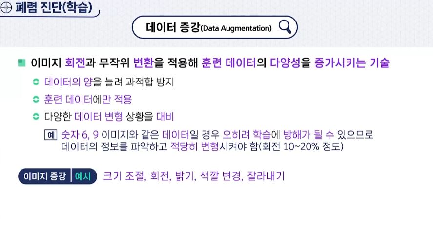 - 그리고 데이터 편향의 문제를 제거해 주기 위해서 여러 가지 어떤 데이터를 회전시키고, 기울여 주고, 이미지 확대해 주고 즉, 데이터 증강 기술을 활용하여 데이터의 편향 문제를 해결한다.