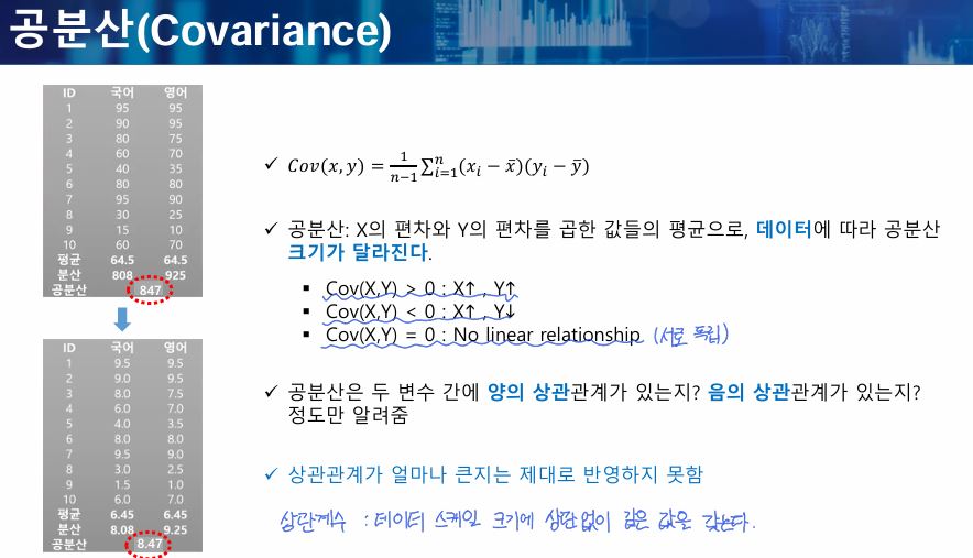 공분산 : 변수가 두 개이다. → 방향 (+, -)는 알지만 크기는 모른다.