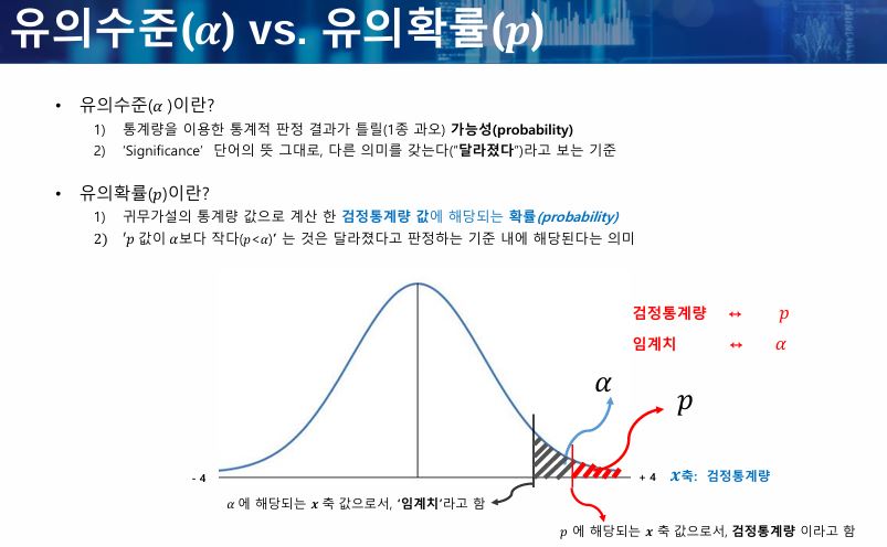 - 귀무가설 H0 : 과거에서부터 현재까지 알고 있던 사실 = 통계량 값 → 변하지 않았다.