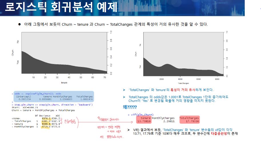 - MonthlyCharges의 회귀계수가 플러스이므로, MonthlyCharges가 1단위 증가하면 통신 서비스사를 변경할 확률이 3% 증가한다는 의미이다.