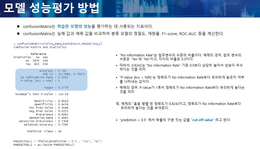 - confusionMatrix: 학습한 모델의 성능을 평가하는데 사용되는 지표이다.