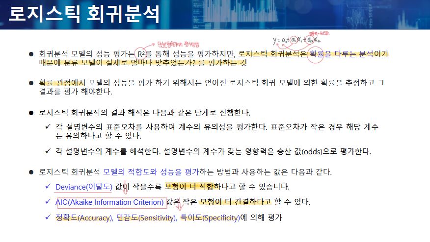 - 선형 회귀분석과는 다르게 종속 변수가 범주형 데이터를 대상으로 하며, 데이터의 결과가 특정 분류로 나뉘기 때문에 일종의 분류 (Classification) 기법이다. [확률(오즈값) = 독립변수1 + 독립변수2 + 독립변수3 + ...]