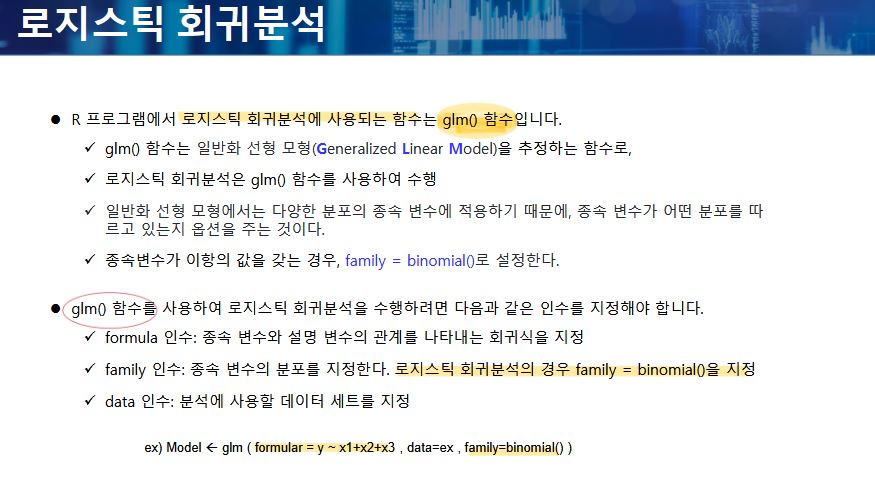 - R에서 로지스틱 회귀분석에 사용되는 함수는 glm() 함수이다.