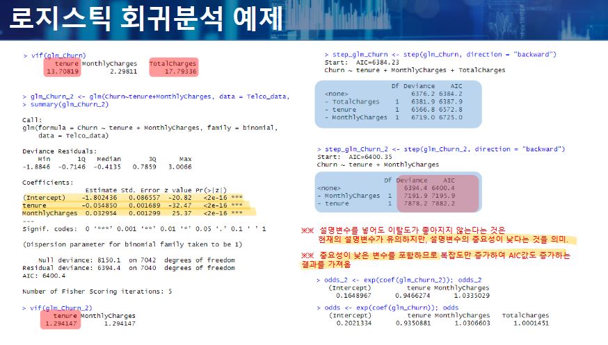 - 변수가 유의한 지를 판단하는 기준은 단계별로 이탈도 (Deviance)를 이용하여 판단한다.