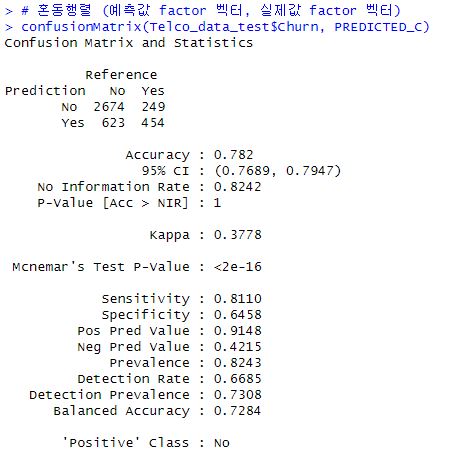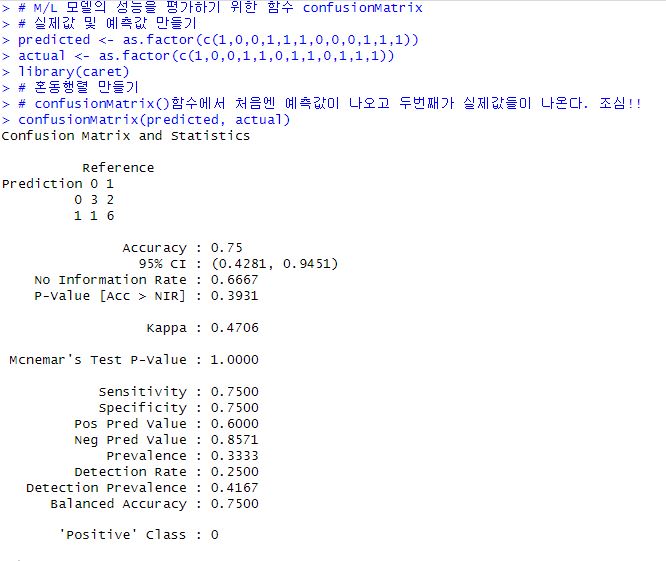 - P-value[Acc > NIR]: 정확도가 No Information Rate보다 유의하게 높은지 여부를 나타내는 값이다. 예제의 경우, P-value가 1로서 정확도가 No Information Rate보다 유의하게 높다는 것을 의미한다.