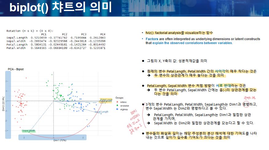 ▶ 변수들의 화살표 길이는 해당 주성분의 분산 해석에 대한 기여도를 나타내는 것으로 길이가 길수록 기여도가 크다는 것을 의미한다.