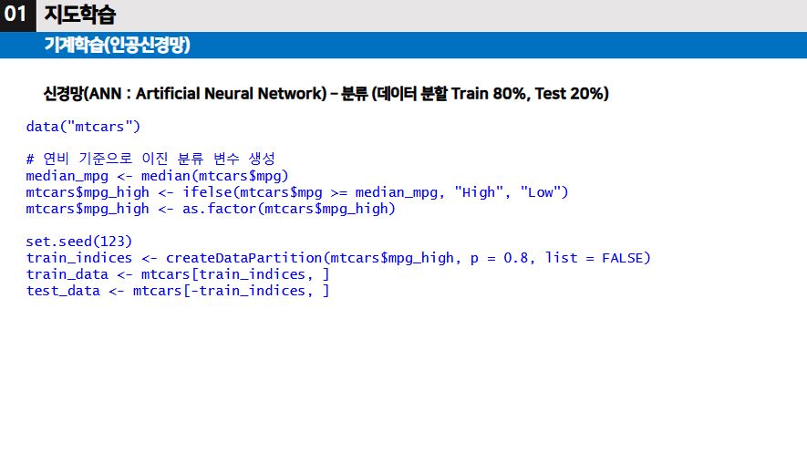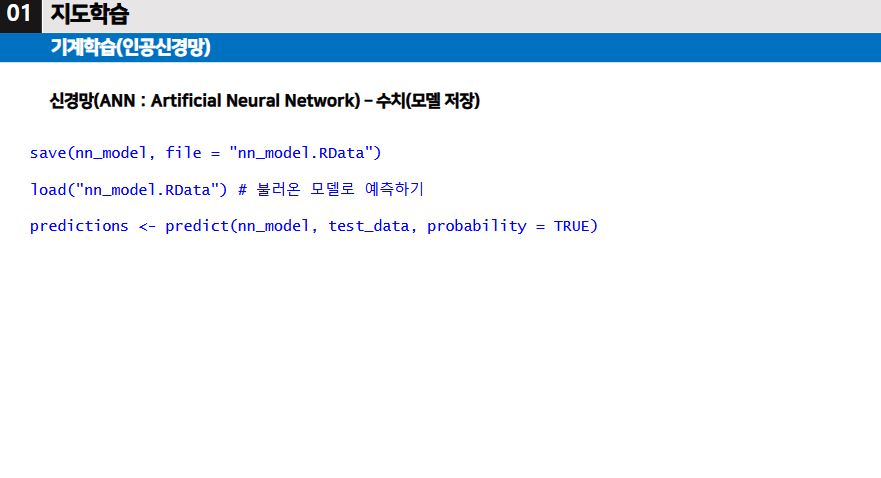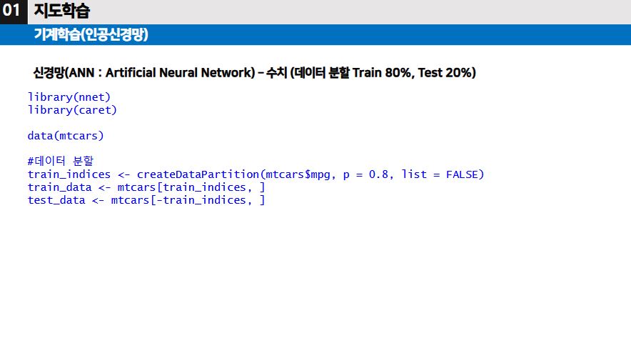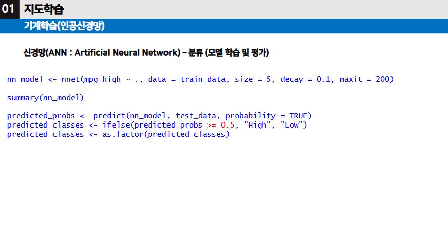 ▶ 지도학습 중에서, 종속변수가 수치형 변수이고 모델을 통해 예측을 수행할 때에는 회귀분석으로 주로 하지만, 종속변수가 범주형 변수이고 모델을 통해 분류를 수행할 때에는 인공신경망, 서포트 벡터 머신, 결정트리, 등의 알고리즘이 있다.
