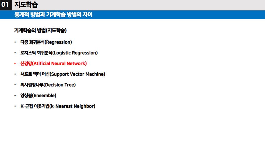 - 지도학습 방법 중 하나로, 뇌 신경망의 원리를 이용해 데이터간의 패턴을 학습하는 학습방법이다.