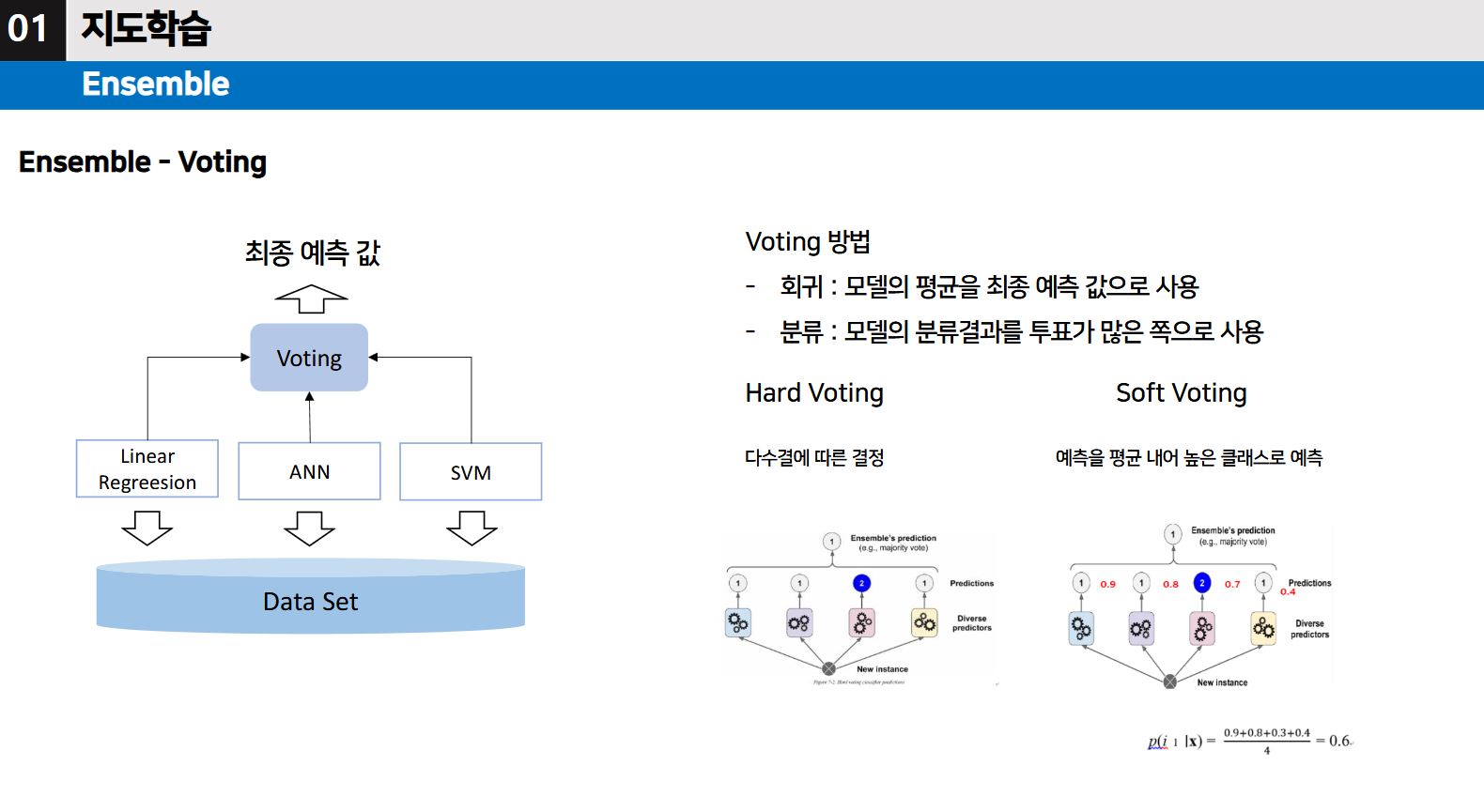 - Voting은 앙상블 학습에서 사용되는 기법 중 하나로, 여러 모델의 결과를 바탕으로 최종 예측 값을 결정한다.