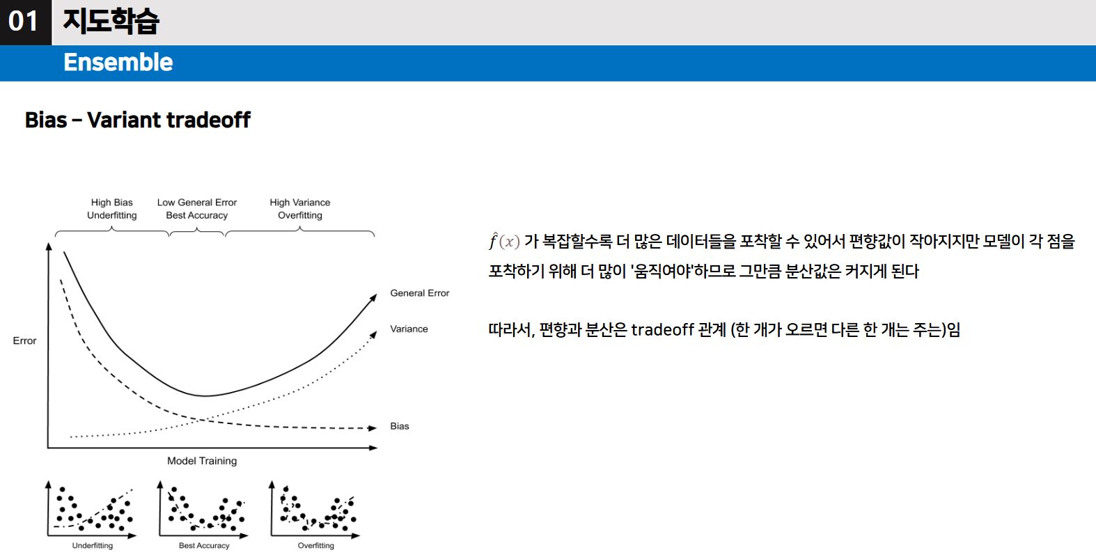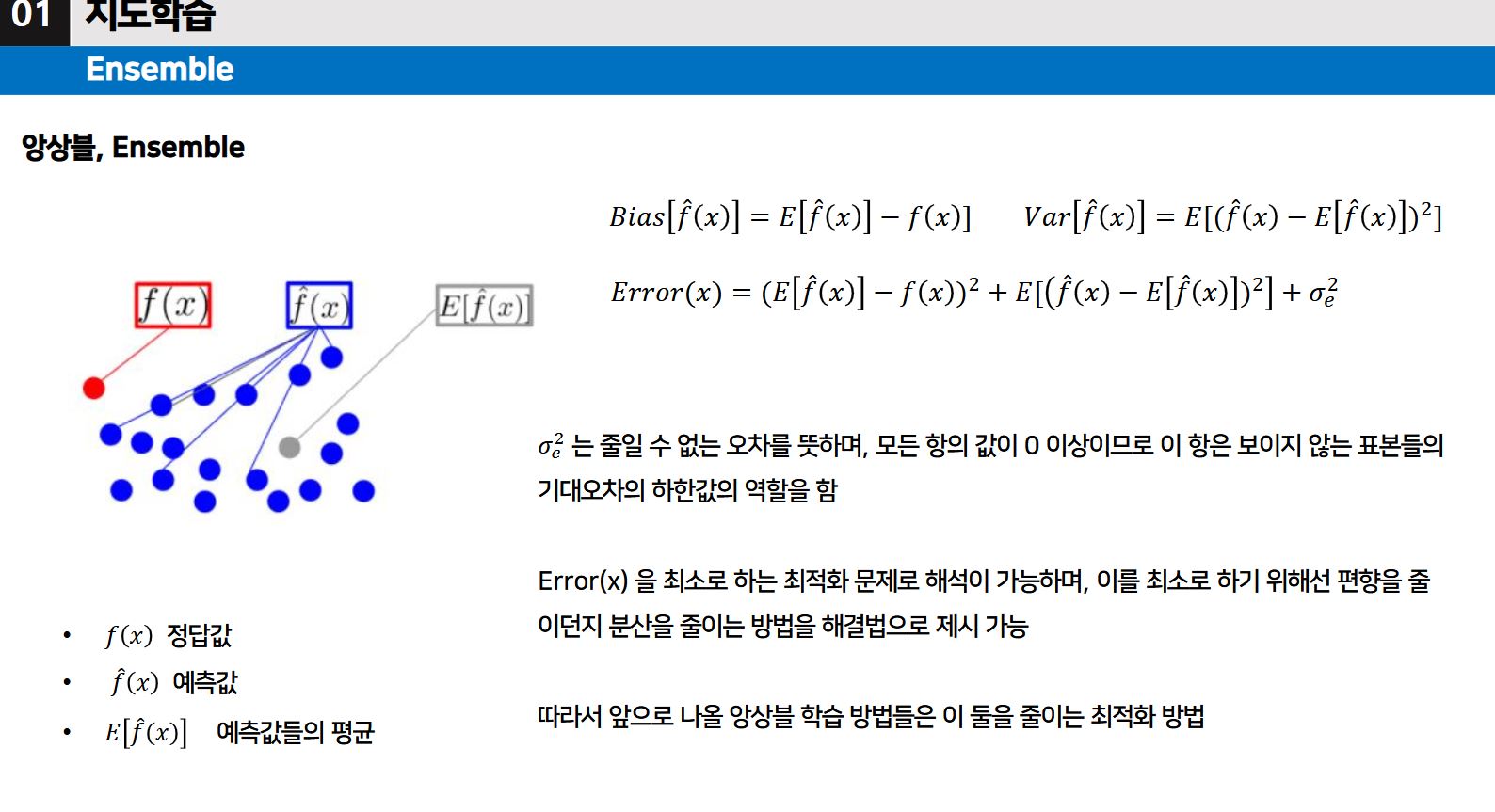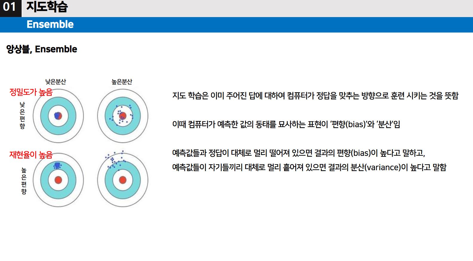 - 앙상블 학습은 여러 개의 모델을 결합하여 예측 성능을 향상시키는 방법이다.